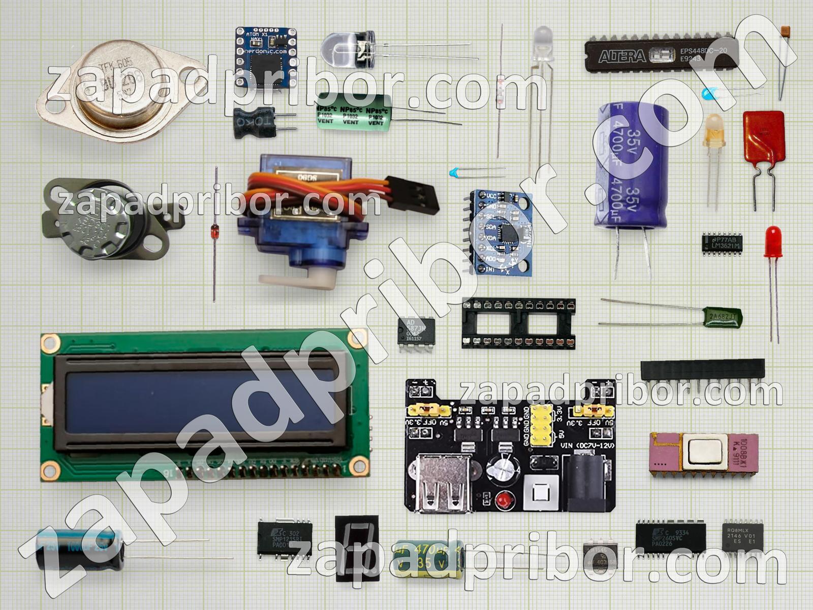 Кроме этих радиодеталей на нашем сайте вы сможете найти большой перечень компонентов. Осуществляйте поиск по основным типам радиодеталей таких как дисплей, кнопка, диодный мост, дроссель, тумблер, переключатель, усилитель, экран, разъем, контакты, соединитель, диод, тиристор, колодки, датчик, преобразователь, микросхема, транзистор, фотодиод, резистор, адаптер, трансформатор, реле, индуктивность, светодиод, резонатор, конденсатор, индикатор и другие.