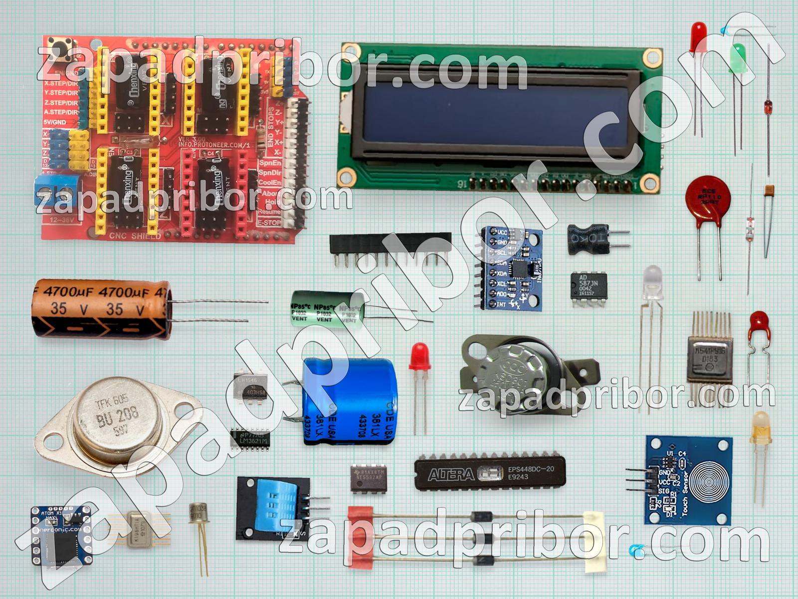 Кроме этих радиодеталей на нашем сайте вы сможете найти большой перечень компонентов. Осуществляйте поиск по основным типам радиодеталей таких как светодиод, контакты, реле, тумблер, разъем, преобразователь, резистор, тиристор, индуктивность, усилитель, микросхема, колодки, датчик, экран, кнопка, диод, соединитель, фотодиод, адаптер, резонатор, дисплей, транзистор, конденсатор, переключатель, дроссель, трансформатор, индикатор, диодный мост и другие.