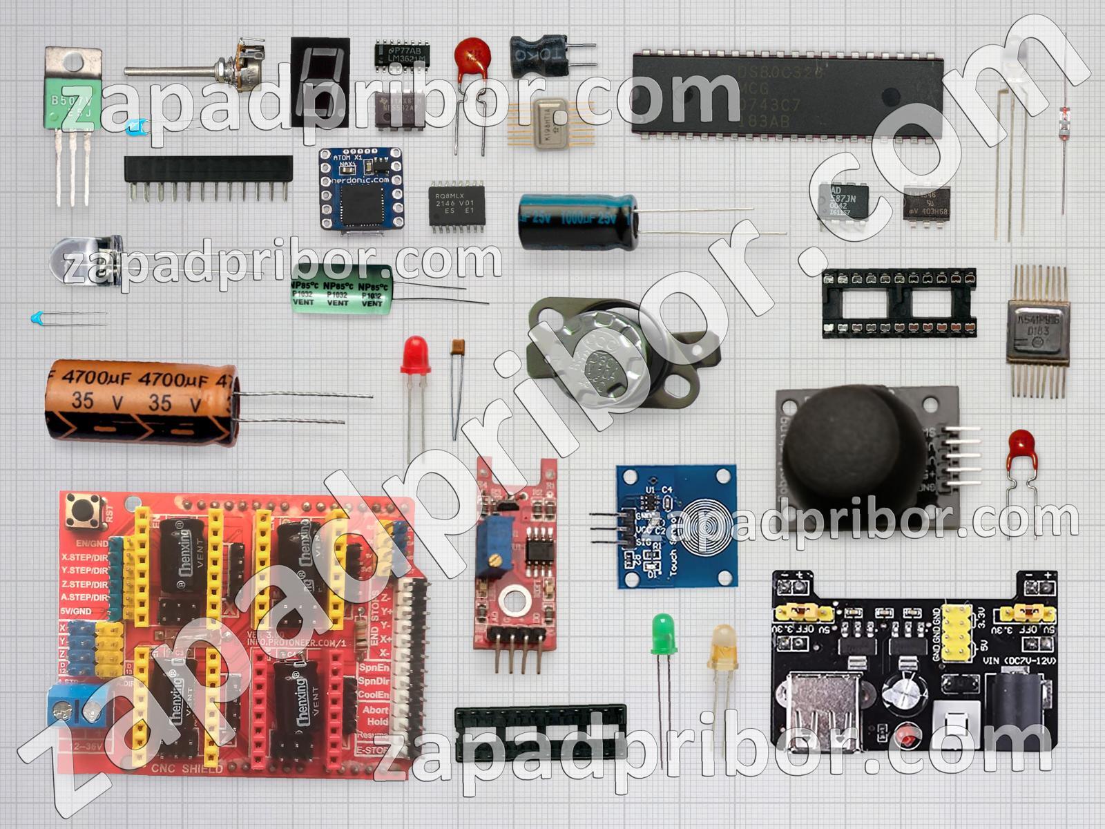 Кроме этих радиодеталей на нашем сайте вы сможете найти большой перечень компонентов. Осуществляйте поиск по основным типам радиодеталей таких как контакты, усилитель, индикатор, колодки, микросхема, тумблер, дроссель, светодиод, экран, датчик, дисплей, кнопка, диодный мост, резистор, разъем, соединитель, преобразователь, переключатель, реле, индуктивность, резонатор, диод, адаптер, конденсатор, фотодиод, транзистор, тиристор, трансформатор и другие.