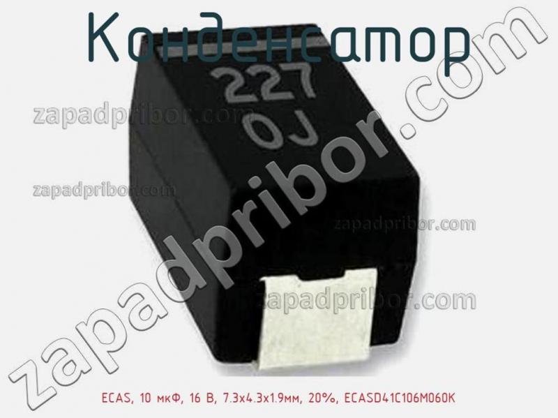 Также изделие может называться: ECAS, 10 мкФ, 16 В, 7.3х4.3х1.9мм, 20%, ECASD41C106M060K