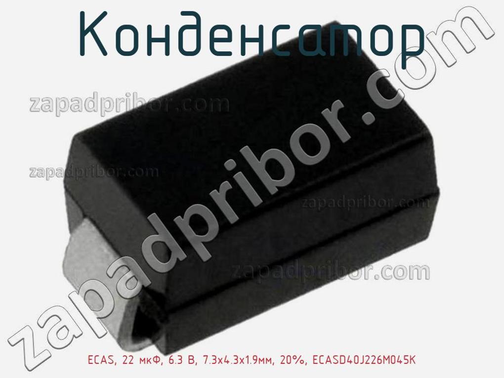 Также данное изделие/прибор может называться: ECAS, 22 мкФ, 6.3 В, 7.3х4.3х1.9мм, 20%, ECASD40J226M045K