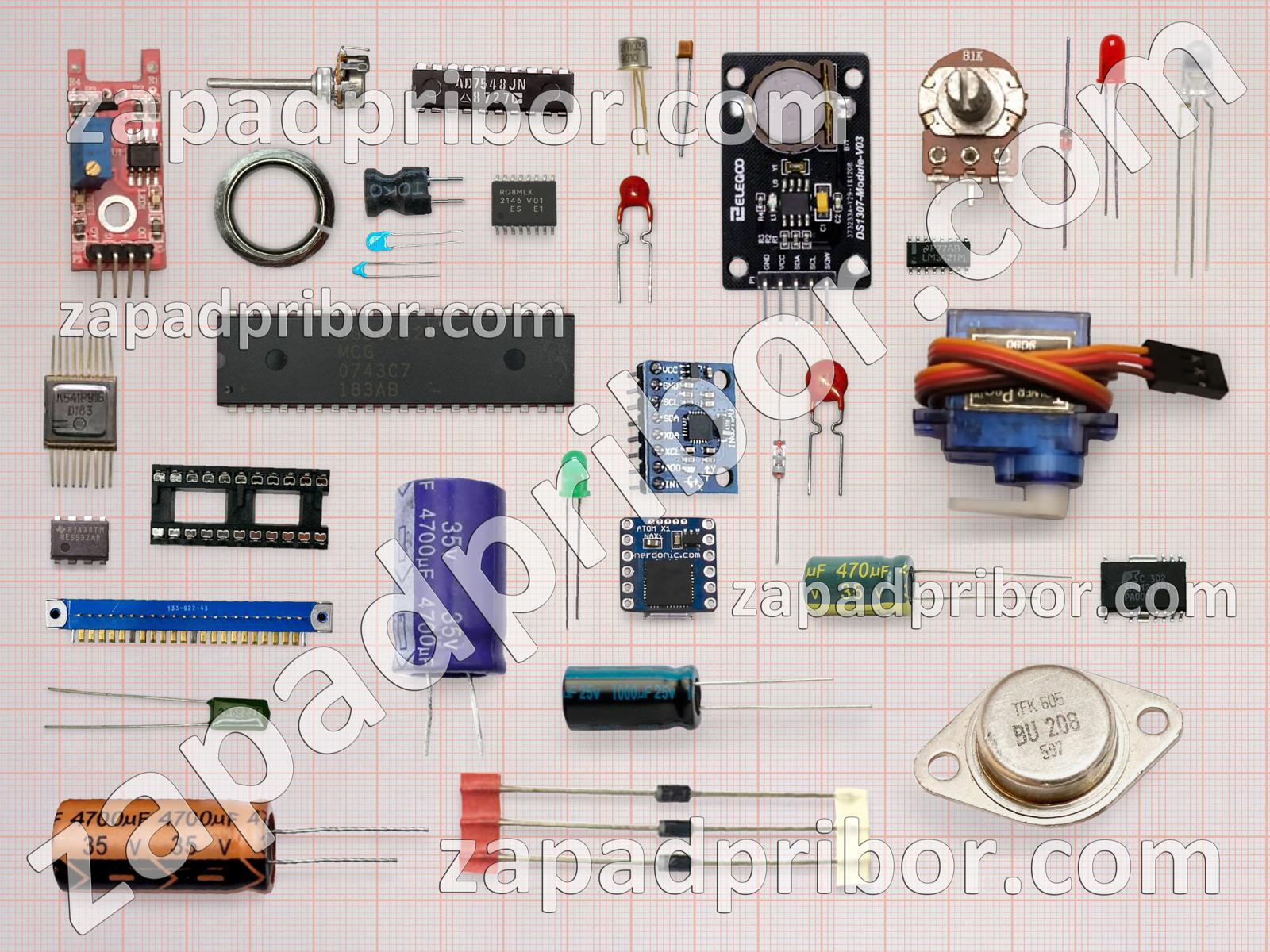 Кроме этих радиодеталей на нашем сайте вы сможете найти большой перечень компонентов. Осуществляйте поиск по основным типам радиодеталей таких как светодиод, экран, тиристор, адаптер, контакты, преобразователь, индикатор, диодный мост, конденсатор, индуктивность, разъем, фотодиод, реле, тумблер, дроссель, усилитель, дисплей, колодки, переключатель, резистор, резонатор, диод, соединитель, транзистор, датчик, микросхема, кнопка, трансформатор и другие.