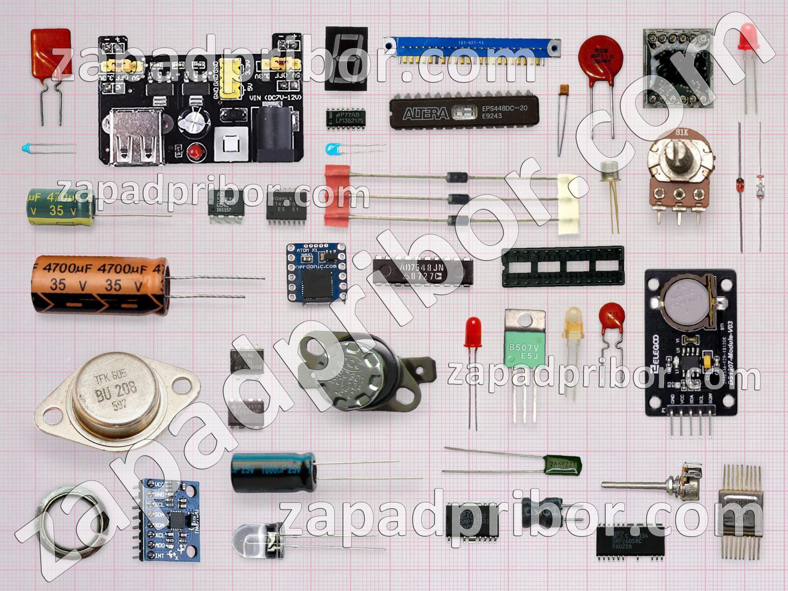 Кроме этих радиодеталей на нашем сайте вы сможете найти большой перечень компонентов. Осуществляйте поиск по основным типам радиодеталей таких как диод, резонатор, адаптер, диодный мост, индуктивность, дроссель, кнопка, экран, фотодиод, разъем, дисплей, индикатор, тиристор, микросхема, усилитель, датчик, соединитель, светодиод, преобразователь, резистор, контакты, транзистор, тумблер, реле, колодки, трансформатор, переключатель, конденсатор и другие.