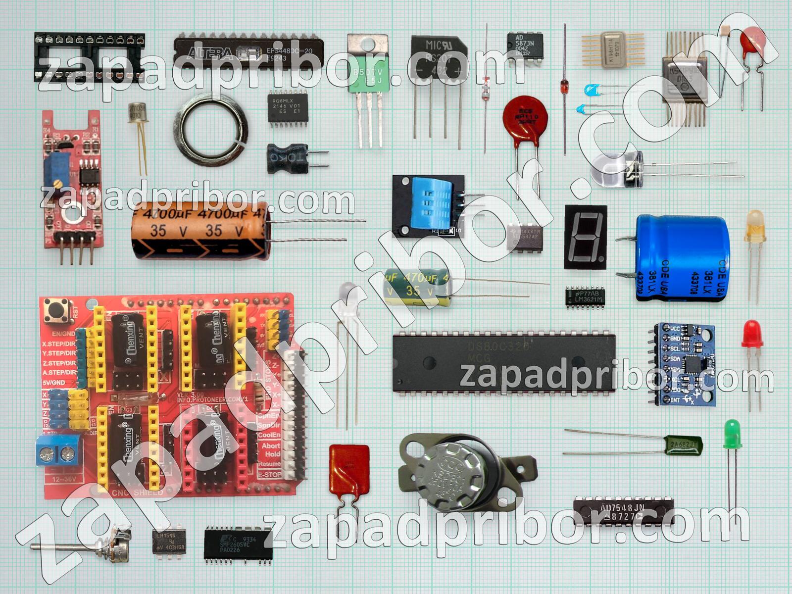 Кроме этих радиодеталей на нашем сайте вы сможете найти большой перечень компонентов. Осуществляйте поиск по основным типам радиодеталей таких как резонатор, индуктивность, диод, дроссель, усилитель, светодиод, адаптер, колодки, индикатор, резистор, дисплей, переключатель, кнопка, соединитель, конденсатор, транзистор, микросхема, тиристор, разъем, фотодиод, диодный мост, экран, тумблер, преобразователь, трансформатор, датчик, реле, контакты и другие.