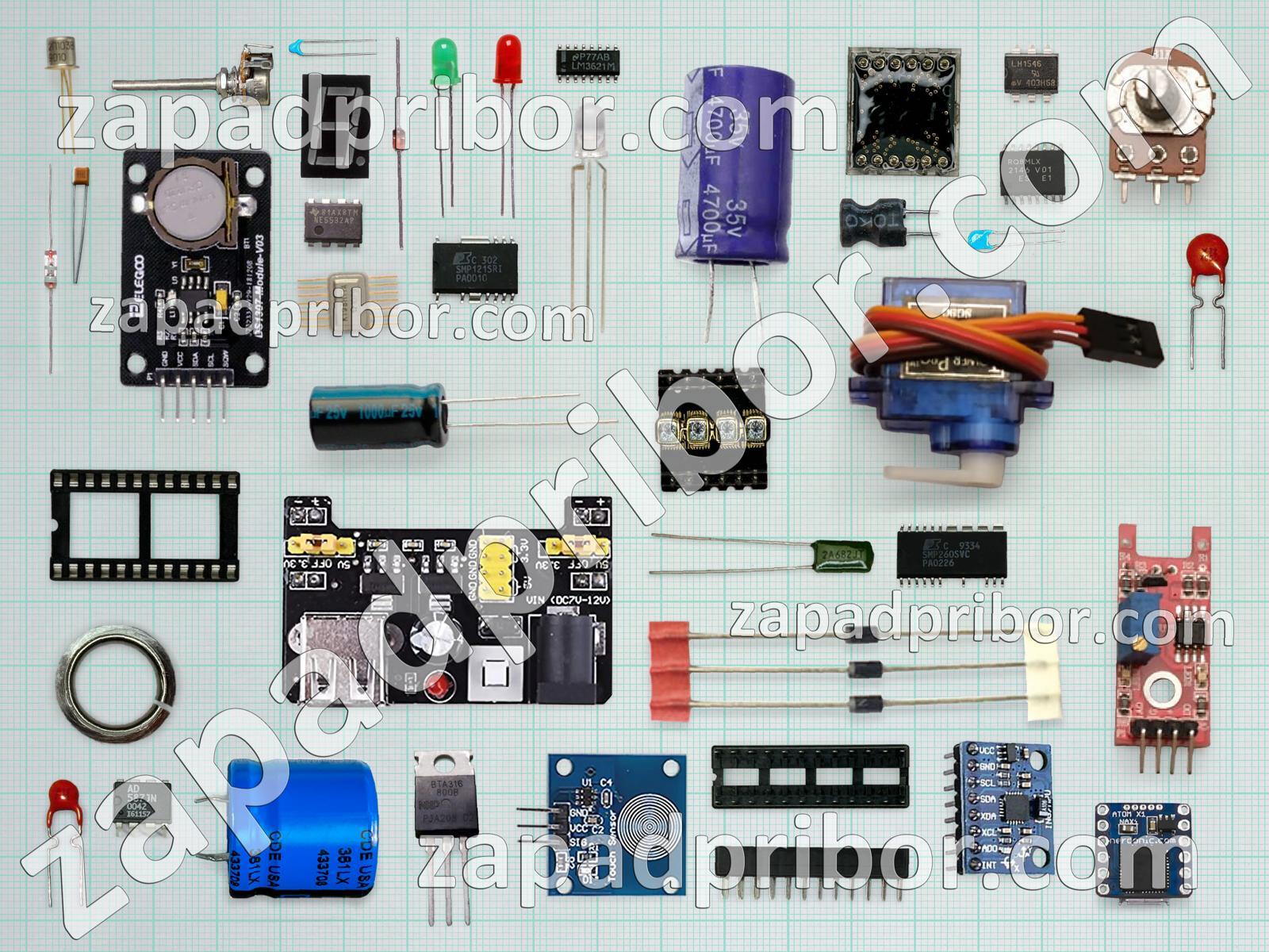 Кроме этих радиодеталей на нашем сайте вы сможете найти большой перечень компонентов. Осуществляйте поиск по основным типам радиодеталей таких как конденсатор, резонатор, усилитель, транзистор, контакты, адаптер, резистор, датчик, соединитель, кнопка, диод, тиристор, переключатель, колодки, фотодиод, дроссель, светодиод, индикатор, трансформатор, микросхема, индуктивность, дисплей, экран, разъем, диодный мост, тумблер, реле, преобразователь и другие.