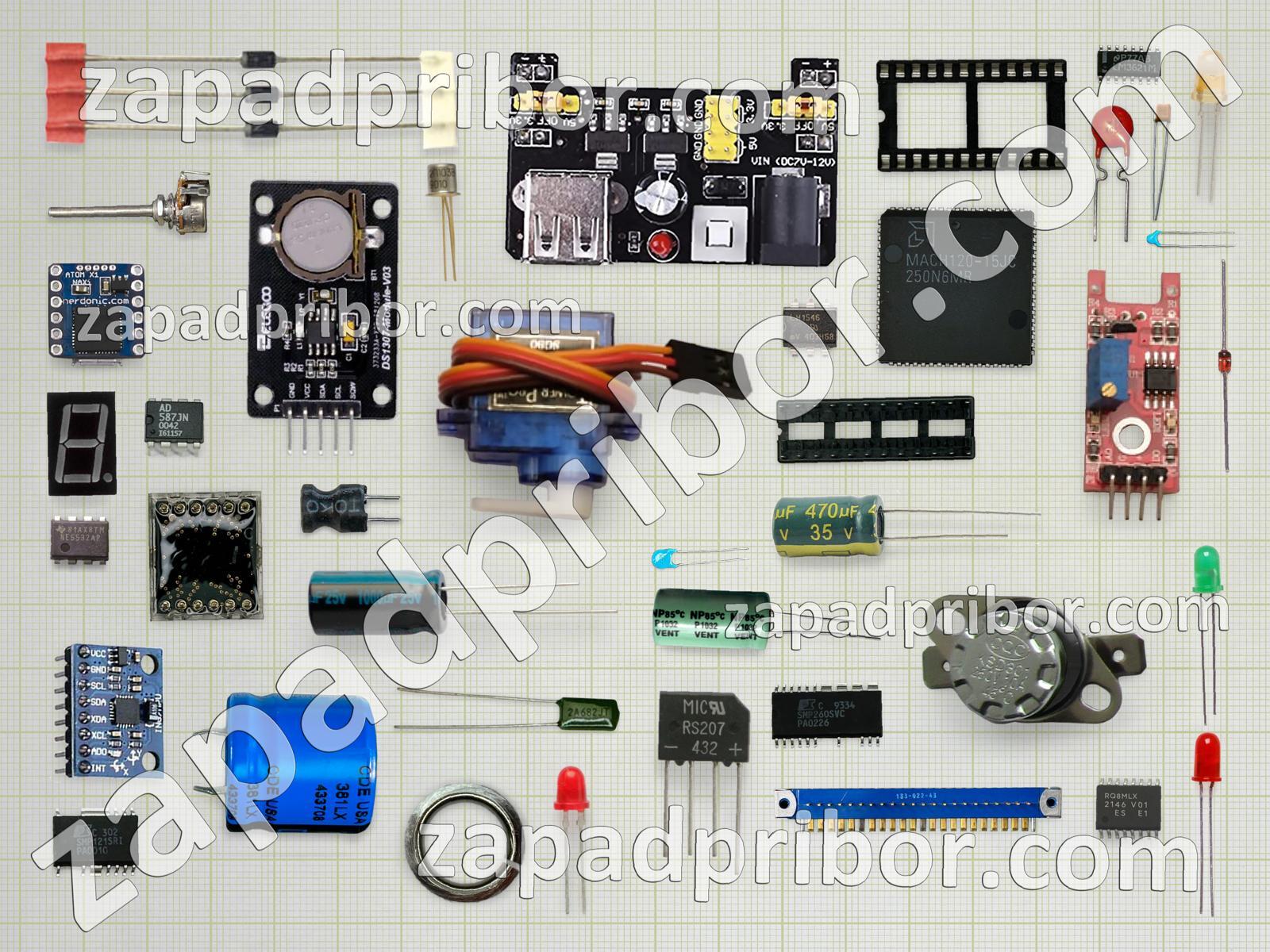 Кроме этих радиодеталей на нашем сайте вы сможете найти большой перечень компонентов. Осуществляйте поиск по основным типам радиодеталей таких как преобразователь, соединитель, индикатор, адаптер, кнопка, дисплей, тиристор, индуктивность, резонатор, транзистор, тумблер, датчик, диодный мост, контакты, микросхема, реле, конденсатор, разъем, трансформатор, дроссель, переключатель, колодки, диод, резистор, усилитель, светодиод, фотодиод, экран и другие.