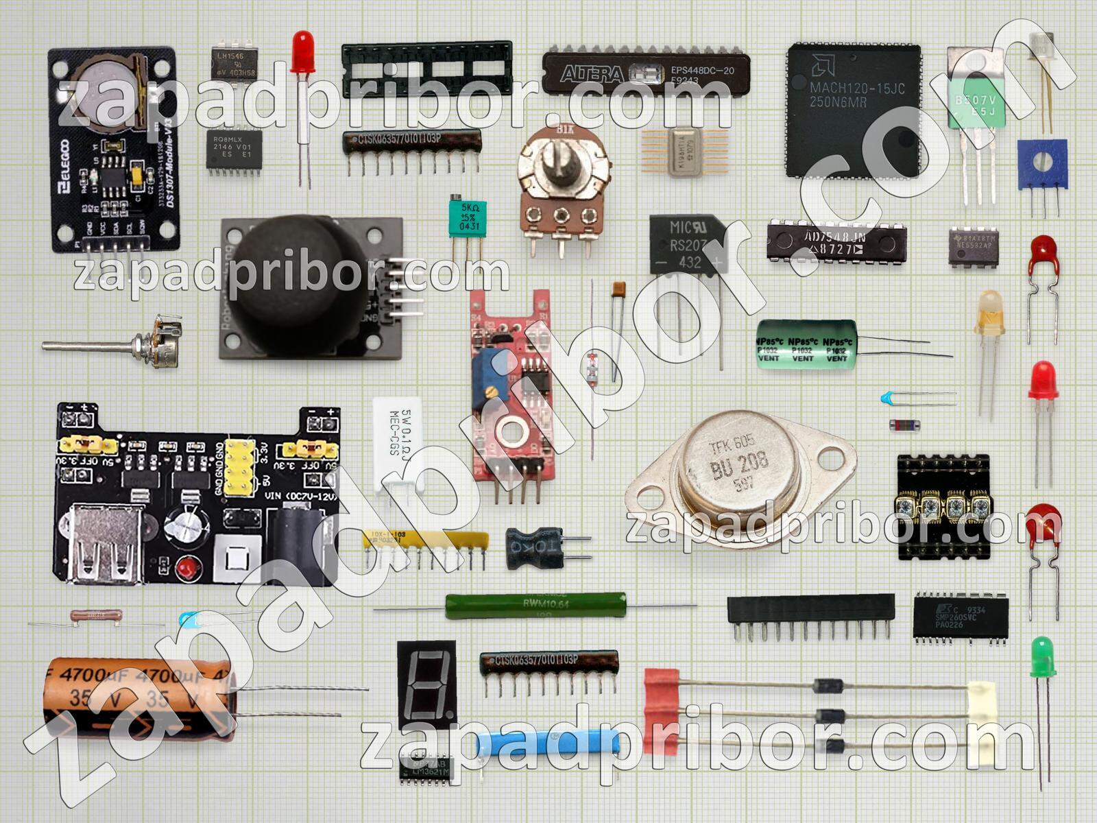 Кроме этих радиодеталей на нашем сайте вы сможете найти большой перечень компонентов. Осуществляйте поиск по основным типам радиодеталей таких как диод, конденсатор, микросхема, соединитель, диодный мост, реле, дроссель, адаптер, индикатор, светодиод, тумблер, кнопка, контакты, резонатор, экран, трансформатор, переключатель, тиристор, преобразователь, фотодиод, резистор, усилитель, датчик, индуктивность, разъем, колодки, дисплей, транзистор и другие.