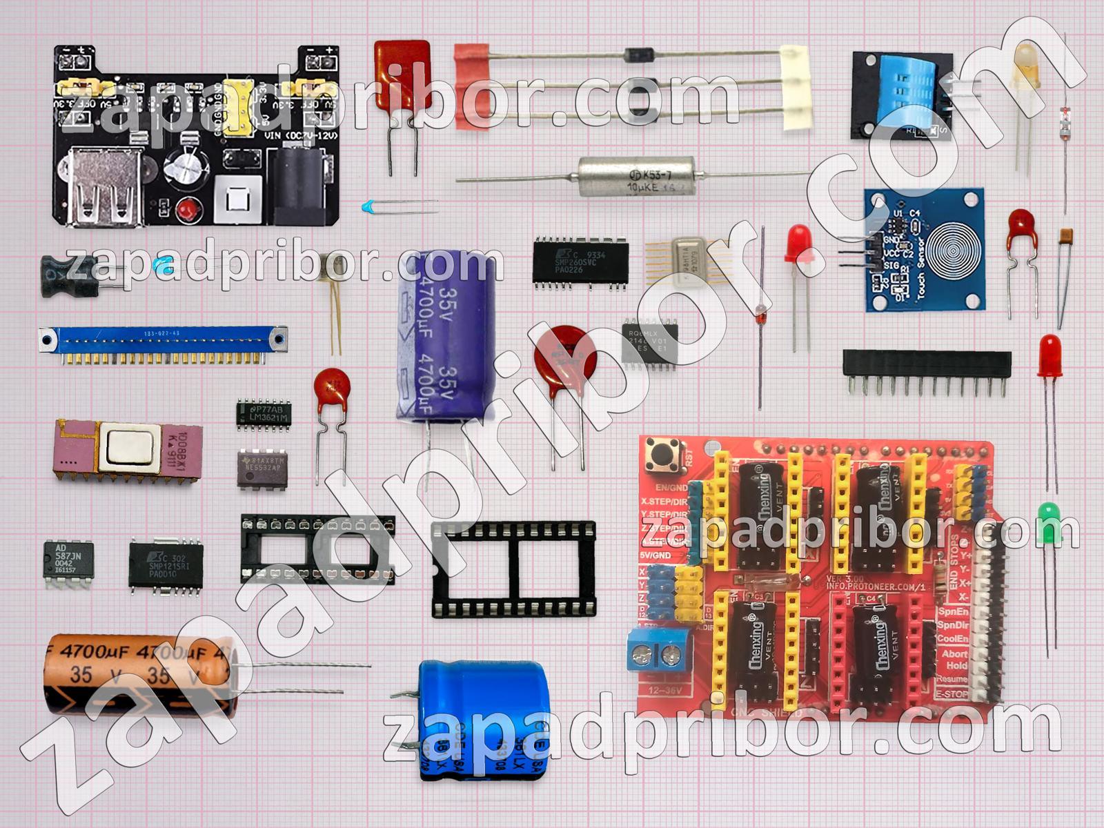 Кроме этих радиодеталей на нашем сайте вы сможете найти большой перечень компонентов. Осуществляйте поиск по основным типам радиодеталей таких как колодки, микросхема, дроссель, тиристор, экран, реле, преобразователь, тумблер, адаптер, резонатор, индуктивность, соединитель, транзистор, трансформатор, разъем, переключатель, диод, конденсатор, кнопка, дисплей, датчик, резистор, усилитель, фотодиод, индикатор, контакты, диодный мост, светодиод и другие.