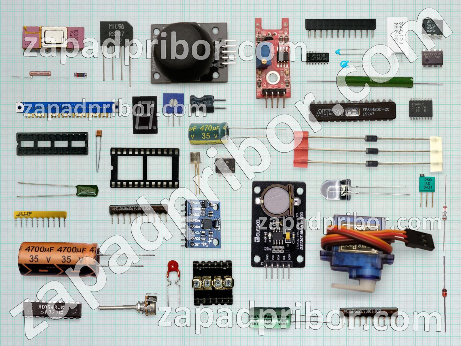 Кроме этих радиодеталей на нашем сайте вы сможете найти большой перечень компонентов. Осуществляйте поиск по основным типам радиодеталей таких как микросхема, колодки, конденсатор, преобразователь, экран, датчик, диодный мост, индикатор, транзистор, резистор, дисплей, контакты, фотодиод, светодиод, соединитель, разъем, индуктивность, кнопка, усилитель, тумблер, резонатор, тиристор, переключатель, реле, диод, дроссель, адаптер, трансформатор и другие.