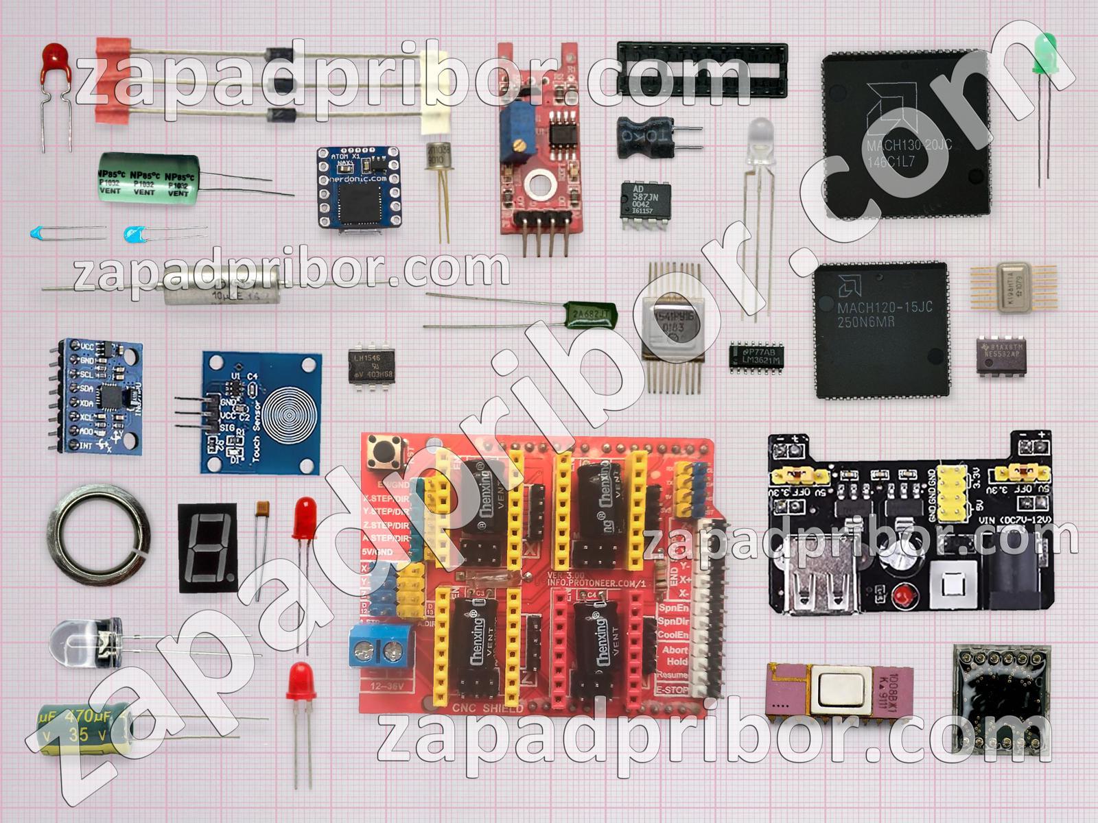 Кроме этих радиодеталей на нашем сайте вы сможете найти большой перечень компонентов. Осуществляйте поиск по основным типам радиодеталей таких как соединитель, экран, резистор, контакты, реле, разъем, колодки, диод, тумблер, усилитель, фотодиод, трансформатор, транзистор, конденсатор, переключатель, светодиод, индуктивность, кнопка, дисплей, дроссель, тиристор, резонатор, микросхема, датчик, индикатор, диодный мост, преобразователь, адаптер и другие.