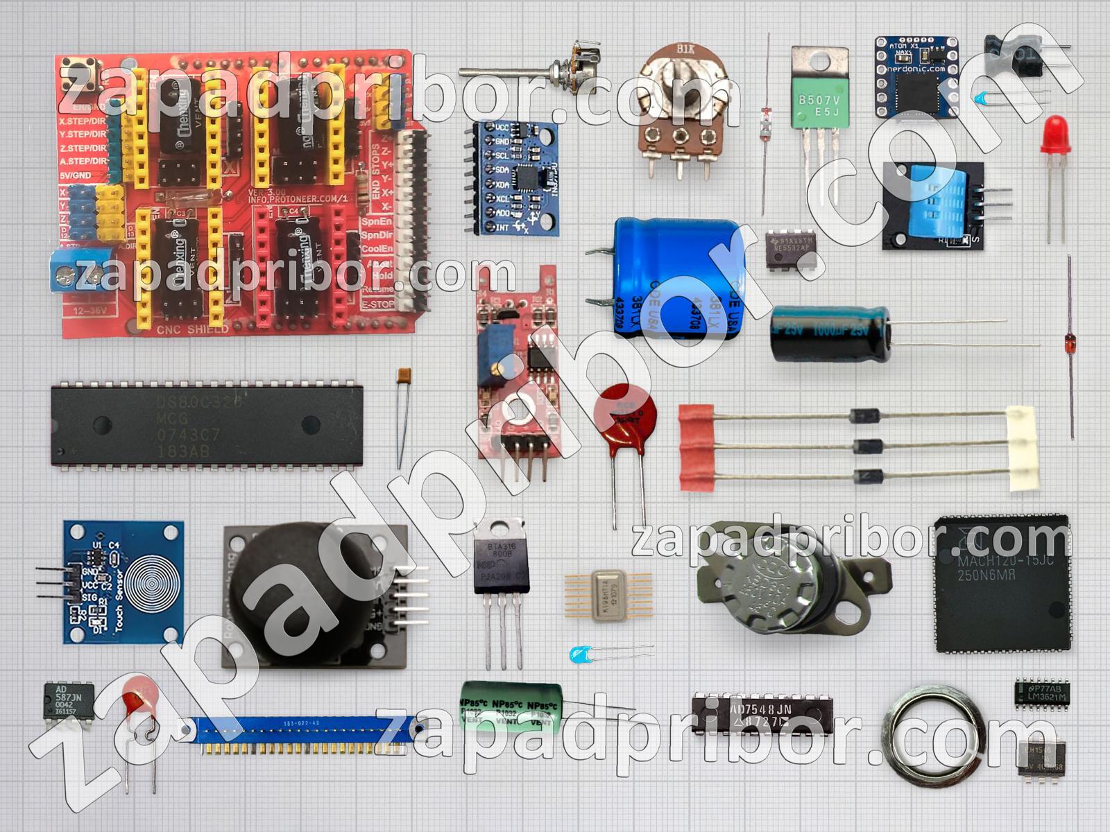 Кроме этих радиодеталей на нашем сайте вы сможете найти большой перечень компонентов. Осуществляйте поиск по основным типам радиодеталей таких как переключатель, контакты, датчик, дисплей, колодки, усилитель, микросхема, разъем, конденсатор, тумблер, фотодиод, соединитель, резонатор, диод, индикатор, кнопка, тиристор, индуктивность, транзистор, реле, резистор, экран, адаптер, светодиод, диодный мост, дроссель, преобразователь, трансформатор и другие.