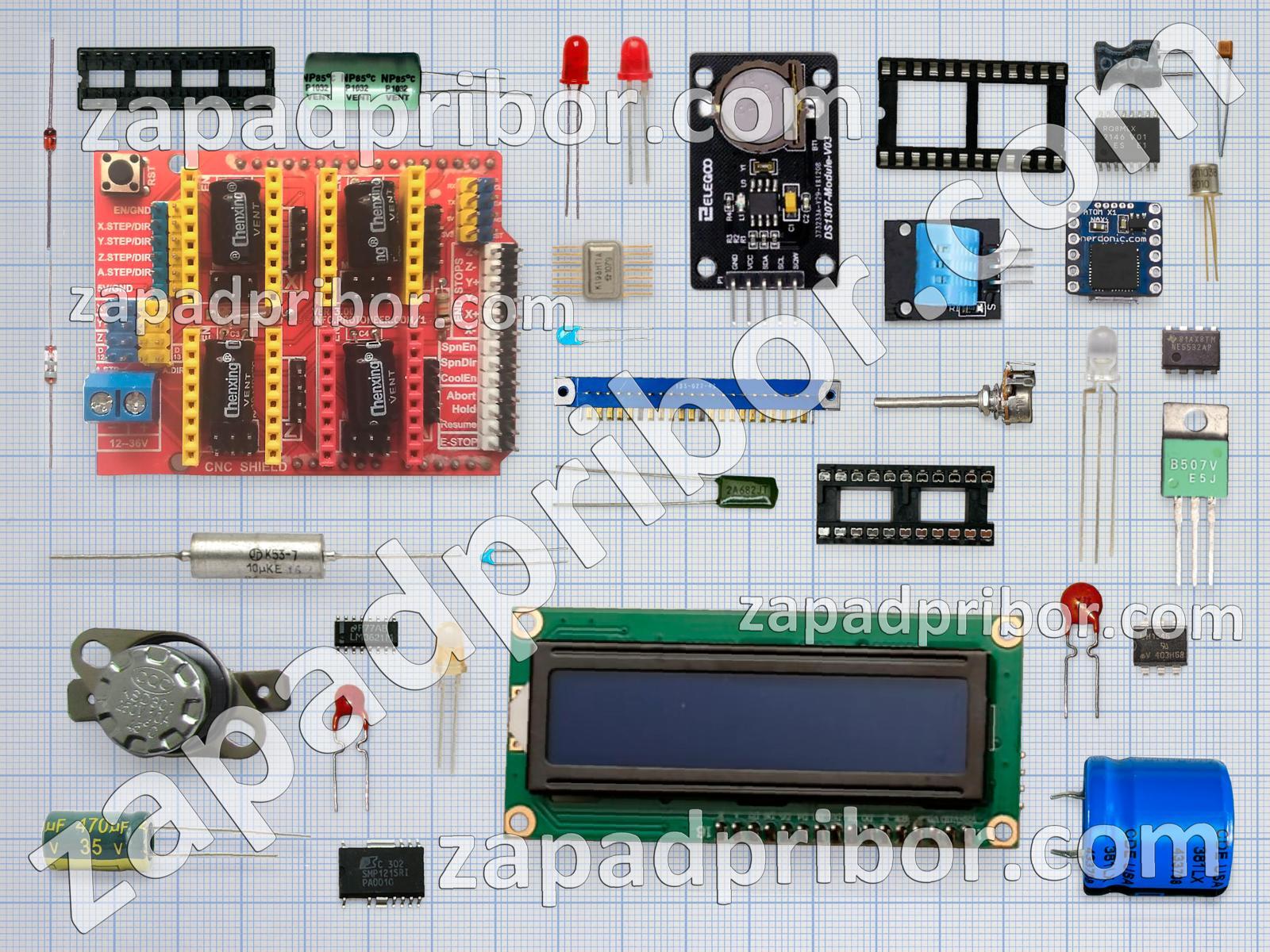 Кроме этих радиодеталей на нашем сайте вы сможете найти большой перечень компонентов. Осуществляйте поиск по основным типам радиодеталей таких как реле, транзистор, контакты, колодки, тумблер, датчик, дисплей, разъем, индуктивность, дроссель, конденсатор, резистор, диод, экран, резонатор, усилитель, тиристор, адаптер, фотодиод, соединитель, преобразователь, диодный мост, кнопка, микросхема, индикатор, светодиод, переключатель, трансформатор и другие.
