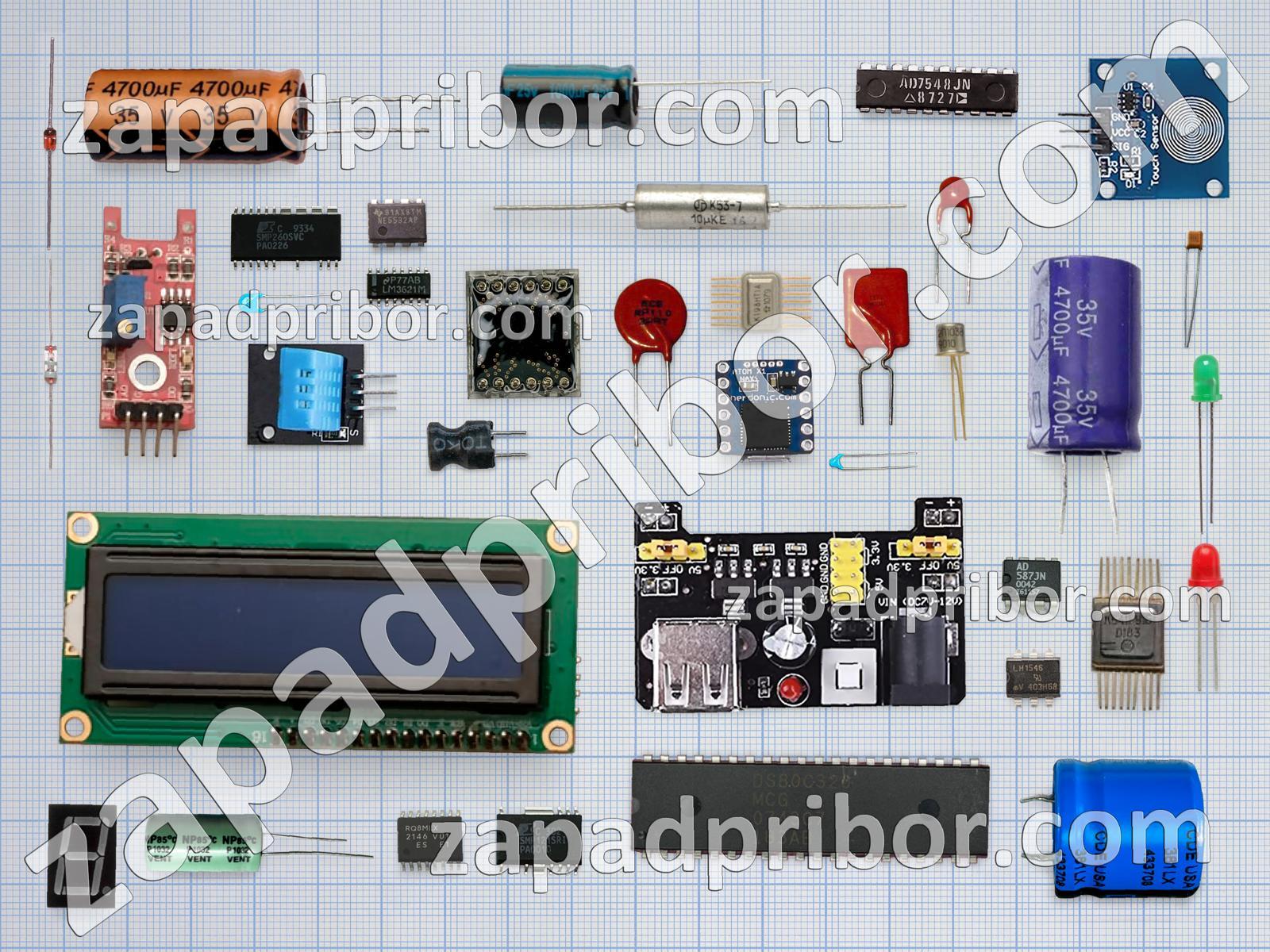 Кроме этих радиодеталей на нашем сайте вы сможете найти большой перечень компонентов. Осуществляйте поиск по основным типам радиодеталей таких как колодки, разъем, датчик, адаптер, дисплей, усилитель, транзистор, диод, фотодиод, тиристор, соединитель, резистор, трансформатор, контакты, переключатель, кнопка, индуктивность, экран, светодиод, реле, индикатор, преобразователь, резонатор, конденсатор, диодный мост, микросхема, дроссель, тумблер и другие.