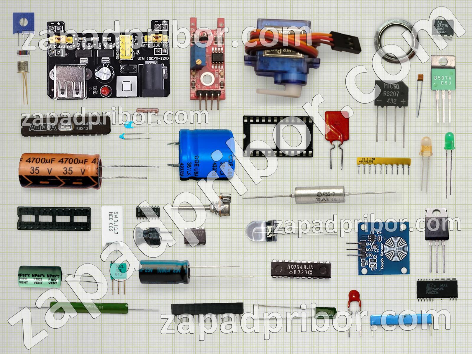Кроме этих радиодеталей на нашем сайте вы сможете найти большой перечень компонентов. Осуществляйте поиск по основным типам радиодеталей таких как контакты, светодиод, трансформатор, транзистор, датчик, переключатель, резонатор, экран, индикатор, резистор, адаптер, тумблер, тиристор, колодки, преобразователь, диодный мост, дроссель, дисплей, кнопка, конденсатор, фотодиод, разъем, индуктивность, реле, микросхема, диод, усилитель, соединитель и другие.