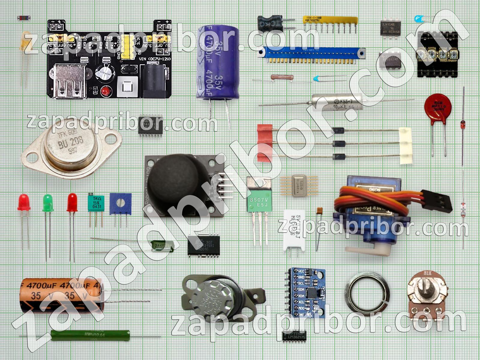 Кроме этих радиодеталей на нашем сайте вы сможете найти большой перечень компонентов. Осуществляйте поиск по основным типам радиодеталей таких как переключатель, резистор, колодки, микросхема, дисплей, разъем, фотодиод, адаптер, тиристор, трансформатор, экран, датчик, светодиод, реле, дроссель, конденсатор, усилитель, соединитель, индуктивность, контакты, тумблер, кнопка, индикатор, преобразователь, транзистор, диодный мост, резонатор, диод и другие.