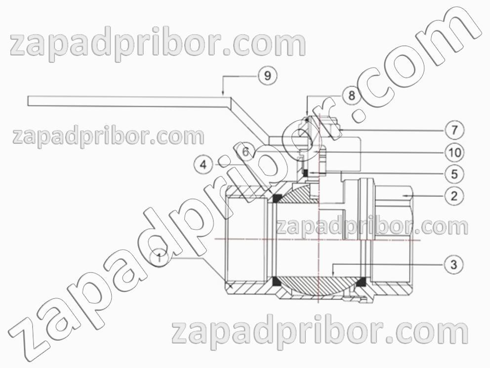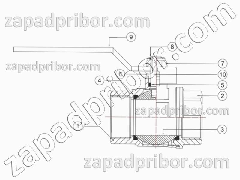 1.Корпус – латунь; 2.Муфта – латунь; 3.Шар – хром; 4.Кольцо уплотнения шара – фторопласт; 5.Кольцо уплотнения штока – фторопласт; 6.Гайка поджимаемая – латунь; 7.Гайка крепления ручки – ГОСТ 2526; 8. 9.Ручка – сталь; 10.Шток – латунь.