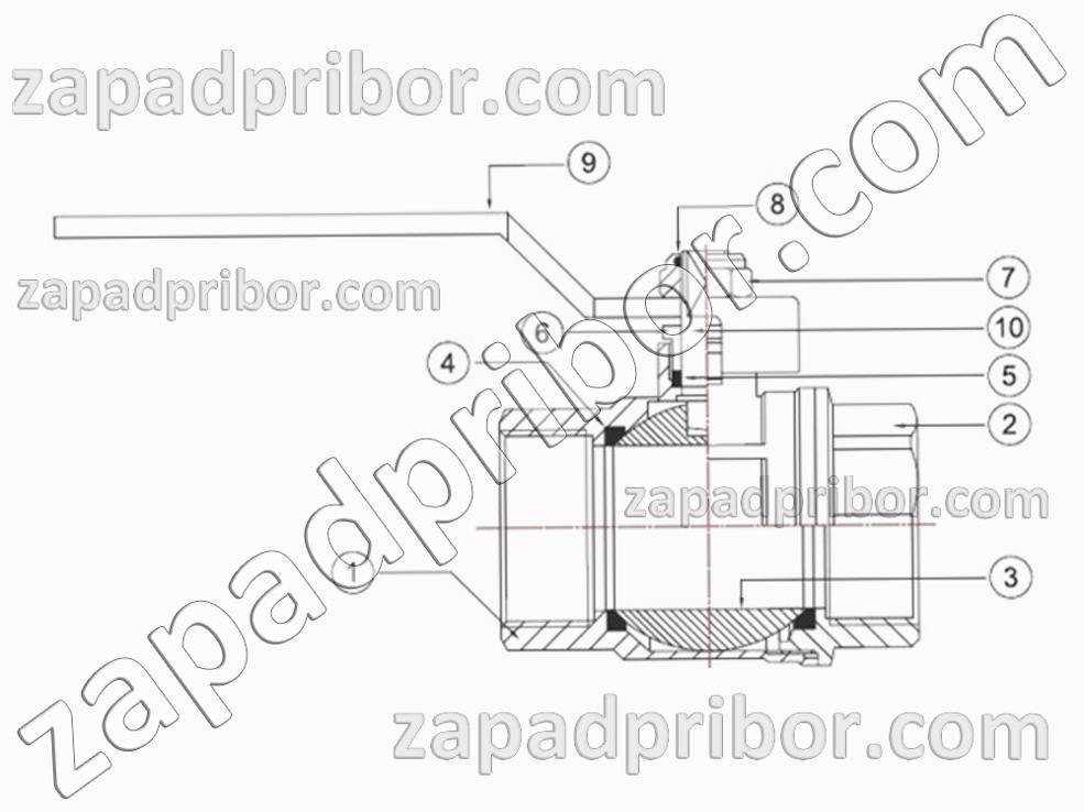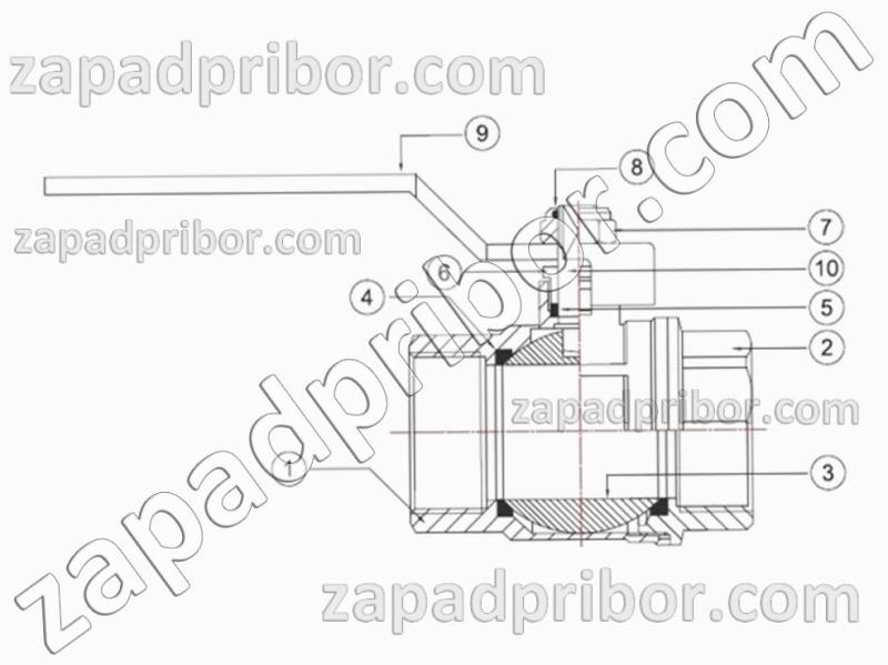1.Корпус – латунь; 2.Муфта – латунь; 3.Шар – хром; 4.Кольцо уплотнения шара – фторопласт; 5.Кольцо уплотнения штока – фторопласт; 6.Гайка поджимаемая – латунь; 7.Гайка крепления ручки – ГОСТ 2526; 8. 9.Ручка – сталь; 10.Шток – латунь.