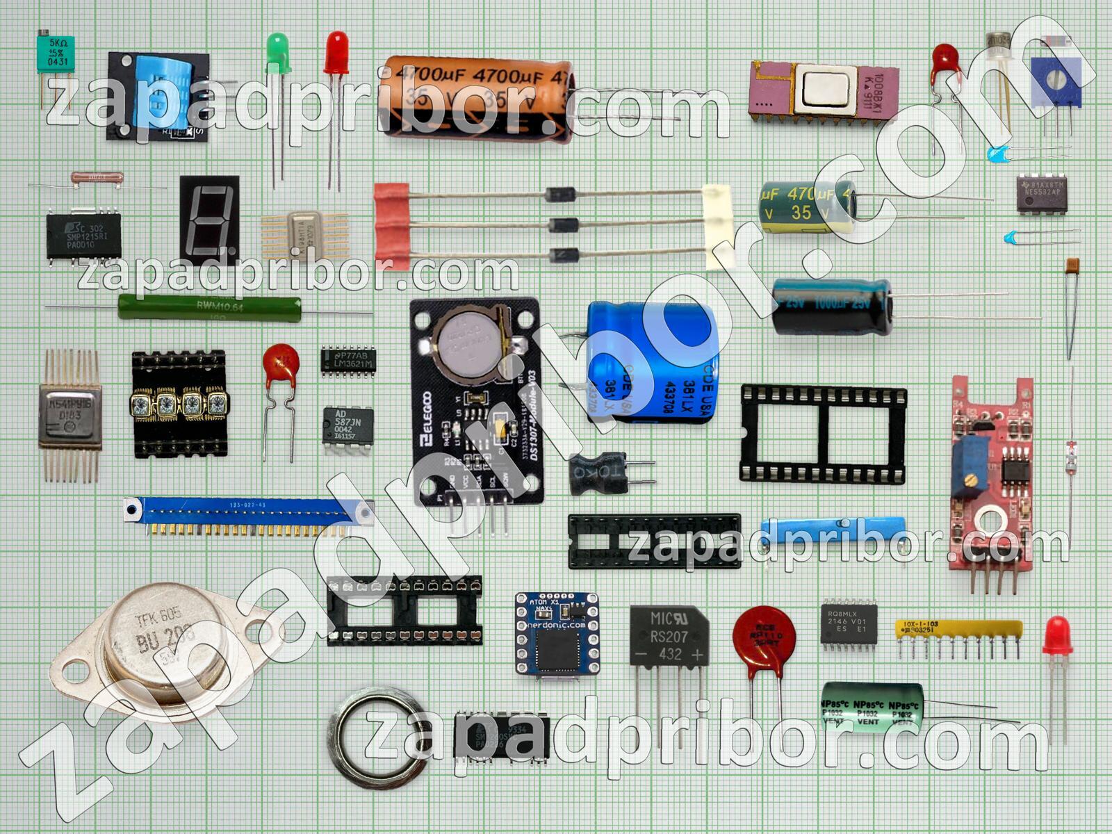 Кроме этих радиодеталей на нашем сайте вы сможете найти большой перечень компонентов. Осуществляйте поиск по основным типам радиодеталей таких как адаптер, усилитель, датчик, кнопка, дроссель, тиристор, соединитель, диод, контакты, трансформатор, колодки, экран, тумблер, разъем, резонатор, конденсатор, индикатор, транзистор, светодиод, реле, микросхема, преобразователь, фотодиод, дисплей, диодный мост, резистор, индуктивность, переключатель и другие.