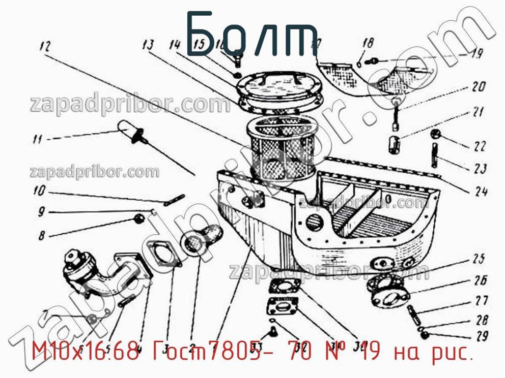 Наш отдел технического контроля гарантирует отсутствие брака и других несоответствий технической документации у всех болтов представленных на нашем сайте. По вопросам покупки М10х16.68 Гост7805- 70 обращайтесь в отдел продаж. Для информации о цене, наличии, сроках поставки, сроке гарантии и по других вопросах обращайтесь по телефонам, указанным в контактах или оставьте запрос через форму обратной связи. Болт, номер 19 на чертеже, Ванна масляная 6Д49.179спч-4 и другие запасные части для 49 (Ч 26/26) , а также другие болты и похожие изделия представлены на сайте zapadpribor.com.