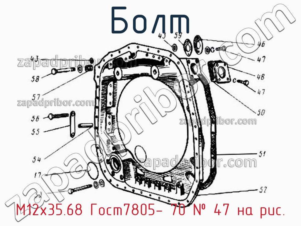 Компания со своей стороны гарантирует отсутствие каких-либо дефектов, несовершенств или неточностей у комплектации и документации болта. М12х35.68 Гост7805- 70 можно заказать, связавшись с нашим отделом продаж. Наши менеджеры всегда радостно предоставят вам всю информацию о товаре, его наличии, цене и т.д. Для этого позвоните по указанным телефонам или оставьте заявку через форму обратной связи. Болт, номер 47 на чертеже, Привод насосов 3А-6Д49.128спч ч.3 и другие запасные части для 49 (Ч 26/26) , а также другие болты и похожие изделия представлены на сайте zapadpribor.com.