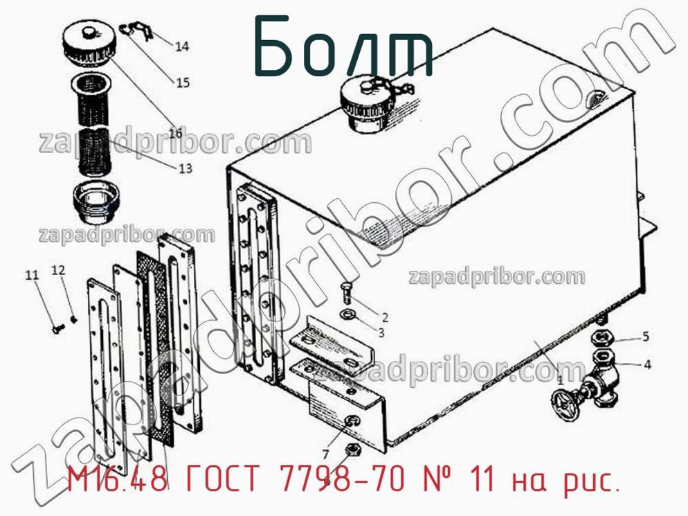 Наш отдел технического контроля дает гарантию отсутствия брака или других несоответствий в технической документации у всех болтов представленных на нашем сайте. Чтобы приобрести М16.48 ГОСТ 7798-70 обратитесь в отдел продаж. Информацию о цене, наличии, сроках поставки, гарантии можно узнать у наших менеджеров. Болт М16.48 ГОСТ 7798-70, номер 11 на чертеже, Установка бака для масла ТЭМ2 и другие запасные части для , а также другие болты и похожие изделия представлены на сайте zapadpribor.com.