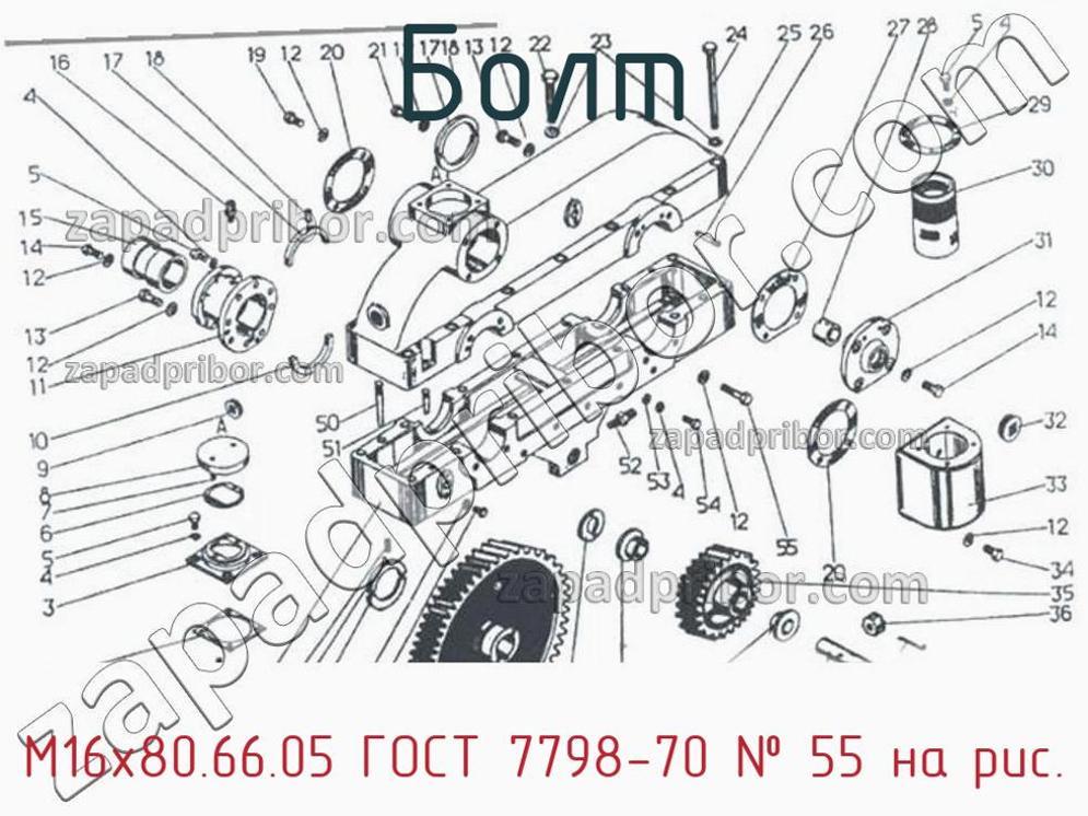 Наш отдел технического контроля гарантирует отсутствие брака и других несоответствий технической документации у всех болтов представленных на нашем сайте. По вопросам покупки М16х80.66.05 ГОСТ 7798-70 обращайтесь в отдел продаж. Для информации о цене, наличии, сроках поставки, сроке гарантии и по других вопросах обращайтесь по телефонам, указанным в контактах или оставьте запрос через форму обратной связи. Болт М16х80.66.05 ГОСТ 7798-70, номер 55 на чертеже, Привод распредвала Д50.08 и другие запасные части для ПДГ4А) , а также другие болты и похожие изделия представлены на сайте zapadpribor.com.