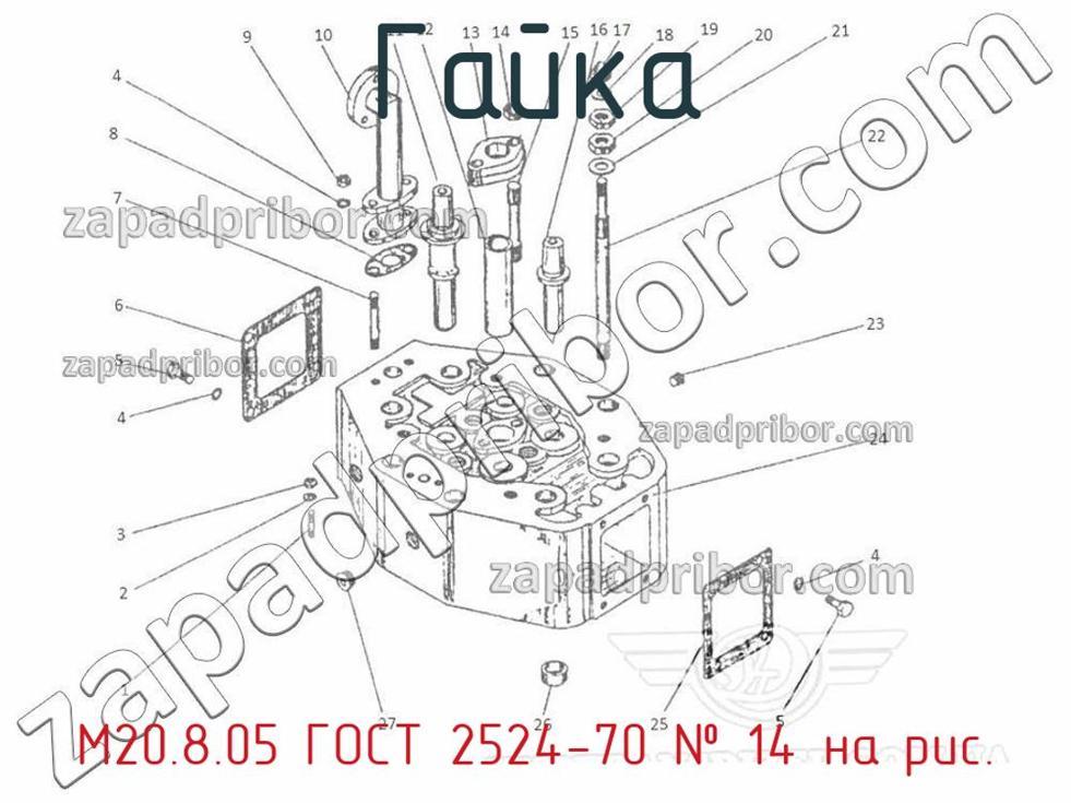Наш отдел технического контроля перед отгрузкой тестирует каждый прибор в лаборатории на соответствие всем техническим характеристикам и требованиям. Чтобы заказать М20.8.05 ГОСТ 2524-70 свяжитесь с нашим отделом продаж. Также вы всегда можете позвонить нашим менеджерам чтобы получить более подробную информацию. Гайка М20.8.05 ГОСТ 2524-70, номер 14 на чертеже, Крышка цилиндров Д50С.06.3 и другие запасные части для ПДГ4А), , а также другие гайки и похожие изделия представлены на сайте zapadpribor.com.