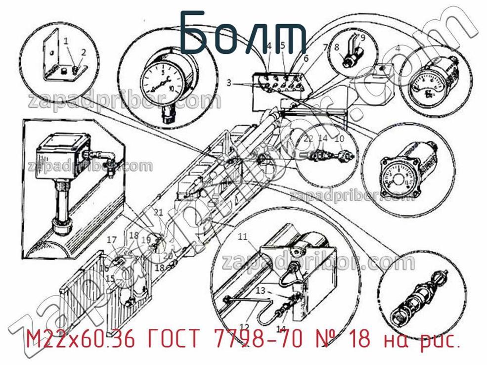 Наш отдел технического контроля перед отгрузкой тестирует каждый прибор в лаборатории на соответствие всем техническим характеристикам и требованиям. Чтобы заказать М22х60.36 ГОСТ 7798-70 свяжитесь с нашим отделом продаж. Также вы всегда можете позвонить нашим менеджерам чтобы получить более подробную информацию. Болт М22х60.36 ГОСТ 7798-70, номер 18 на чертеже, Установка контрольно-измерительных приборов и датчиков-реле и другие запасные части для , а также другие болты и похожие изделия представлены на сайте zapadpribor.com.