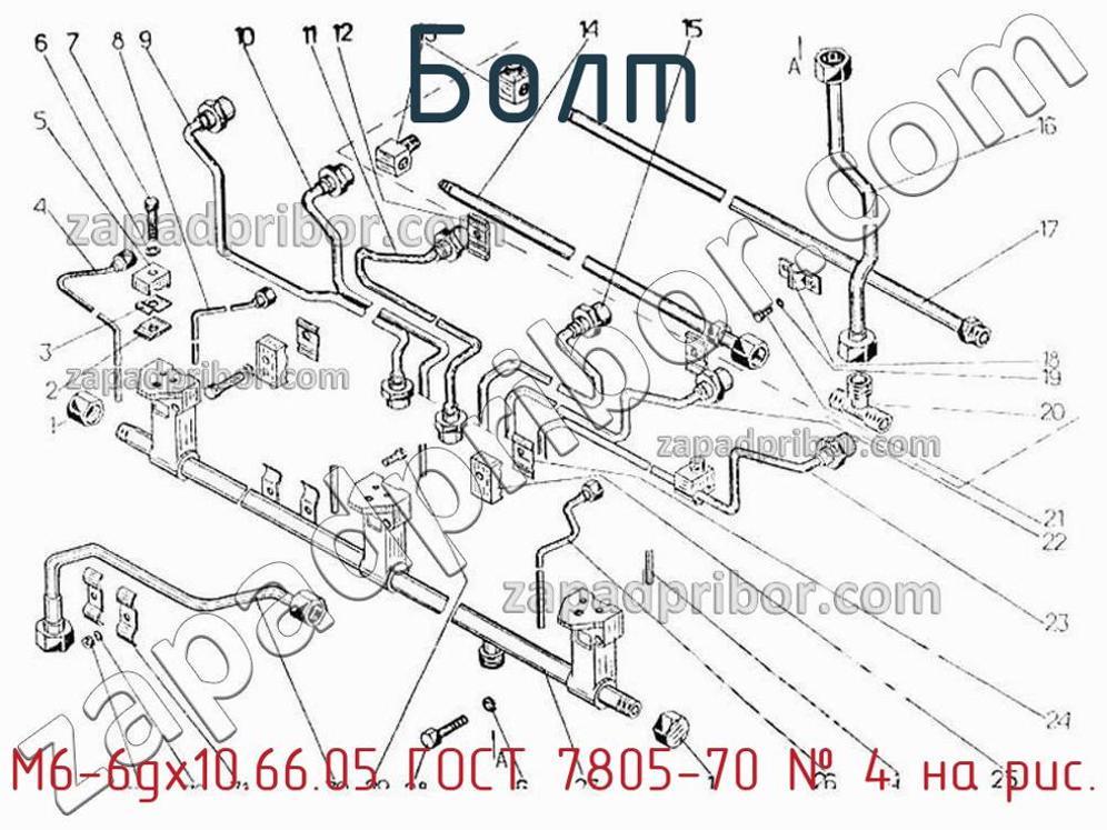 ОТК компании гарантирует отсутствие брака у всех болтов представленных на нашем сайте. Для покупки М6-6gх10.66.05 ГОСТ 7805-70 обратитесь в отдел продаж. Относительно информации о цене, наличии, сроках поставки, гарантии обращайтесь по телефонам, указанным в контактах или оставьте запрос через форму обратной связи. Болт М6-6gх10.66.05 ГОСТ 7805-70, номер 4 на чертеже, Трубопровод топливный Д50.23 и другие запасные части для ПДГ4А) , а также другие болты и похожие изделия представлены на сайте zapadpribor.com.