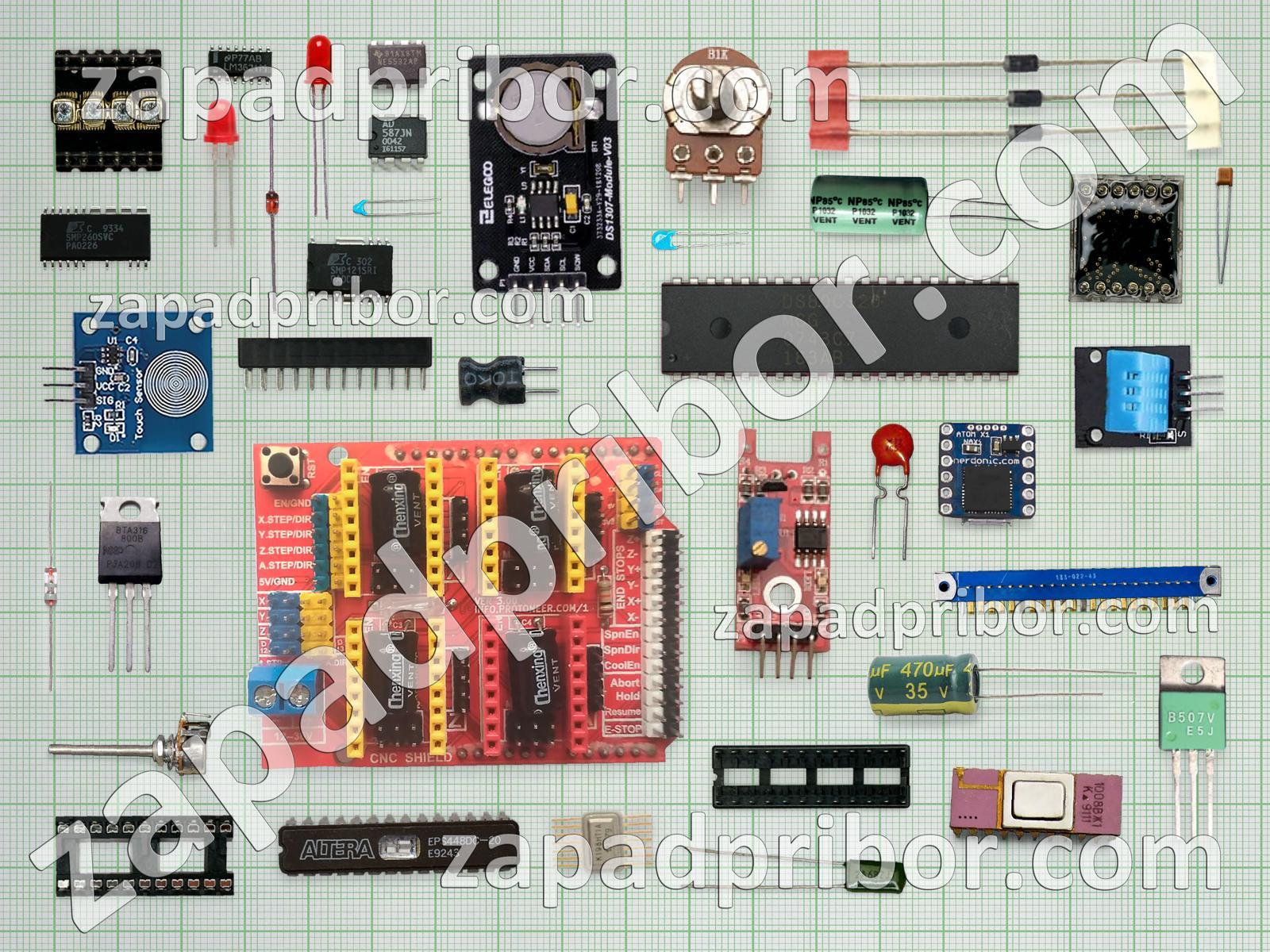 Кроме этих радиодеталей на нашем сайте вы сможете найти большой перечень компонентов. Осуществляйте поиск по основным типам радиодеталей таких как транзистор, разъем, дроссель, резистор, адаптер, трансформатор, экран, усилитель, тумблер, резонатор, дисплей, реле, микросхема, диод, соединитель, конденсатор, кнопка, светодиод, фотодиод, индикатор, тиристор, диодный мост, колодки, переключатель, датчик, индуктивность, преобразователь, контакты и другие.