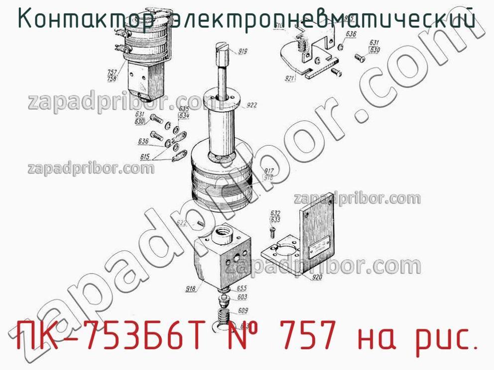 ОТК компании гарантирует отсутствие дефектов у всех контакторов электропневматических на нашем сайте. Для покупки ПК-753Б6Т свяжитесь с отделом продаж. Менеджеры компании предоставят всю информацию о цене, наличии, сроках доставки, гарантии и ответят на любые другие вопросы. Контактор электропневматический ПК-753Б6Т, номер 757 на чертеже, Вентиль электропневматический включающий ВВ-3, ВВ-3Т и другие запасные части для , а также другие контакторы электропневматические и похожие изделия представлены на сайте zapadpribor.com.