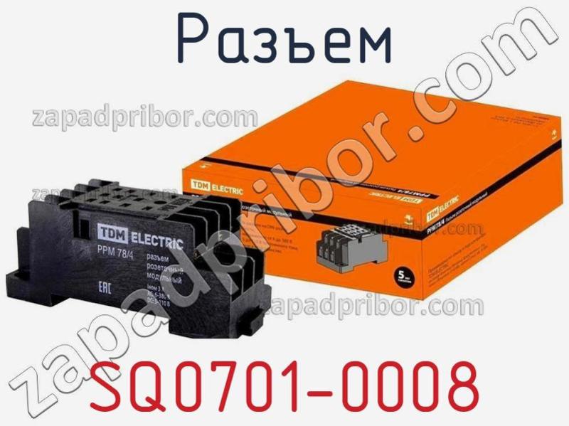 Основные характеристики разъема SQ0701-0008: SQ0701-0008, Разъем РРМ78/4 для РЭК78/4 модульныйПредназначены для передачи команд управления исполнительным элементам путем коммутации их электрических цепей переключающими контактами.Применение:Для управления нагрузками небольшой мощности, требующими большого количества коммутаций. Для дистанционного управления нагрузкой путем подачи управляющего напряжения на катушку Реле . В автоматике инженерного оборудования зданий, насосов, систем вентиляции, отопления, освещения и т.д.. Коммутации электрических цепей переменного и постоянного тока.Преимущества:Ассортимент Реле РЭК гораздо шире ассортимента большинства российских производителей, что позволяет применять Реле РЭК торговой марки TDM ELECTRIC для управления нагрузкой в сетях любого напряжения. В ассортименте Реле РЭК имеются исполнения с индикацией наличия напряжения на управляющей катушке. Более высокое значение номинального тока контактов по сравнению с промежуточным Реле РП-21 позволяет использовать Реле серии РЭК в цепях до 10А. Любое рабочее положение в пространстве. Уменьшенные габариты Реле предоставляют возможность более рационального размещения изделий на монтажной плоскости.Материалы:Применение серебросодержащих контактов повышает надежность контактирования и долговечность Реле .