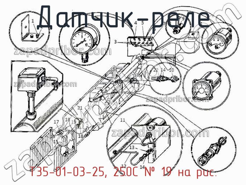 ОТК компании гарантирует отсутствие брака у всех датчиков-реле представленных на нашем сайте. Для покупки Т35-01-03-25, 250С обратитесь в отдел продаж. Относительно информации о цене, наличии, сроках поставки, гарантии обращайтесь по телефонам, указанным в контактах или оставьте запрос через форму обратной связи. Датчик-реле температуры Т35-01-03-25, температура срабатывания 250С, номер 19 на чертеже, Установка контрольно-измерительных приборов и датчиков-реле и другие запасные части для , а также другие датчики-реле и похожие изделия представлены на сайте zapadpribor.com.