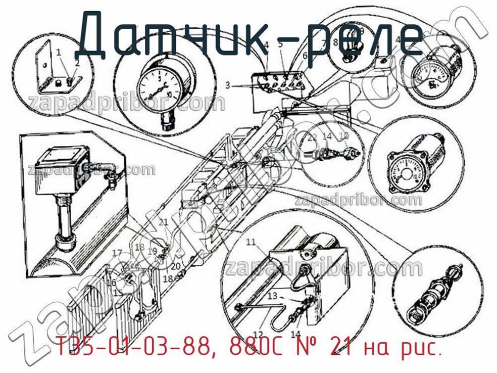 Наш отдел технического контроля гарантирует отсутствие брака и других несоответствий технической документации у всех датчиков-реле представленных на нашем сайте. По вопросам покупки Т35-01-03-88, 880С обращайтесь в отдел продаж. Для информации о цене, наличии, сроках поставки, сроке гарантии и по других вопросах обращайтесь по телефонам, указанным в контактах или оставьте запрос через форму обратной связи. Датчик-реле температуры Т35-01-03-88, температура срабатывания 880С, номер 21 на чертеже, Установка контрольно-измерительных приборов и датчиков-реле и другие запасные части для , а также другие датчики-реле и похожие изделия представлены на сайте zapadpribor.com.