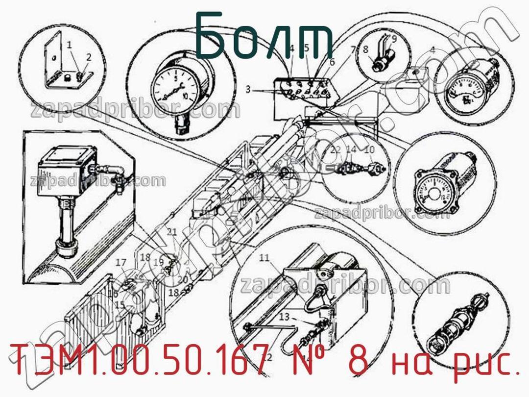 Наш отдел технического контроля дает гарантию отсутствия брака или других несоответствий в технической документации у всех болтов представленных на нашем сайте. Чтобы приобрести ТЭМ1.00.50.167 обратитесь в отдел продаж. Информацию о цене, наличии, сроках поставки, гарантии можно узнать у наших менеджеров. Болт ТЭМ1.00.50.167, номер 8 на чертеже, Установка контрольно-измерительных приборов и датчиков-реле и другие запасные части для , а также другие болты и похожие изделия представлены на сайте zapadpribor.com.