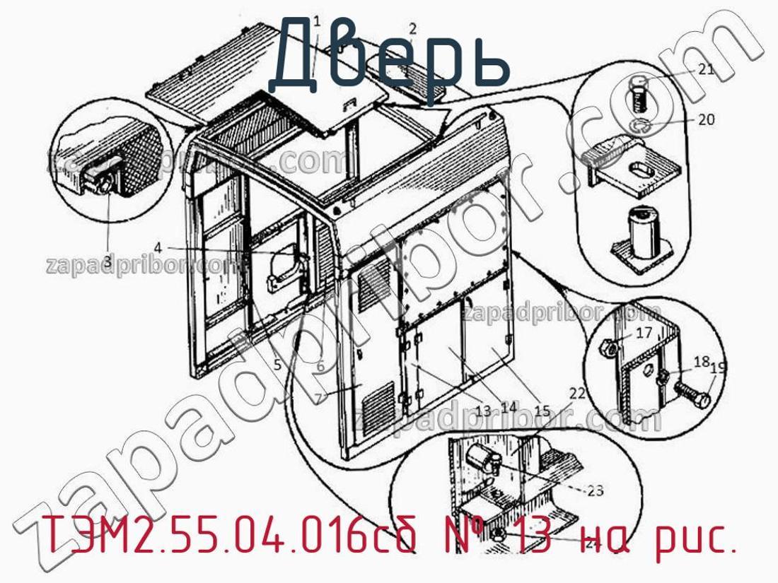 Наш отдел технического контроля гарантирует отсутствие брака или других несоответствий в технической документации или комплектации всех дверей представленных на нашем сайте. Чтобы заказать ТЭМ2.55.04.016сб обращайтесь в отдел продаж. Чтобы узнать цену, наличие, сроки поставки, срок гарантии и другие вопросы позвоните по телефонам указанным в контактах или оставьте заявку через форму обратной связи. Дверь левая ТЭМ2.55.04.016сб, номер 13 на чертеже, Кузов над высоковольтной камерой ТЭМ2С.55.04.000 и другие запасные части для , а также другие двери и похожие изделия представлены на сайте zapadpribor.com.
