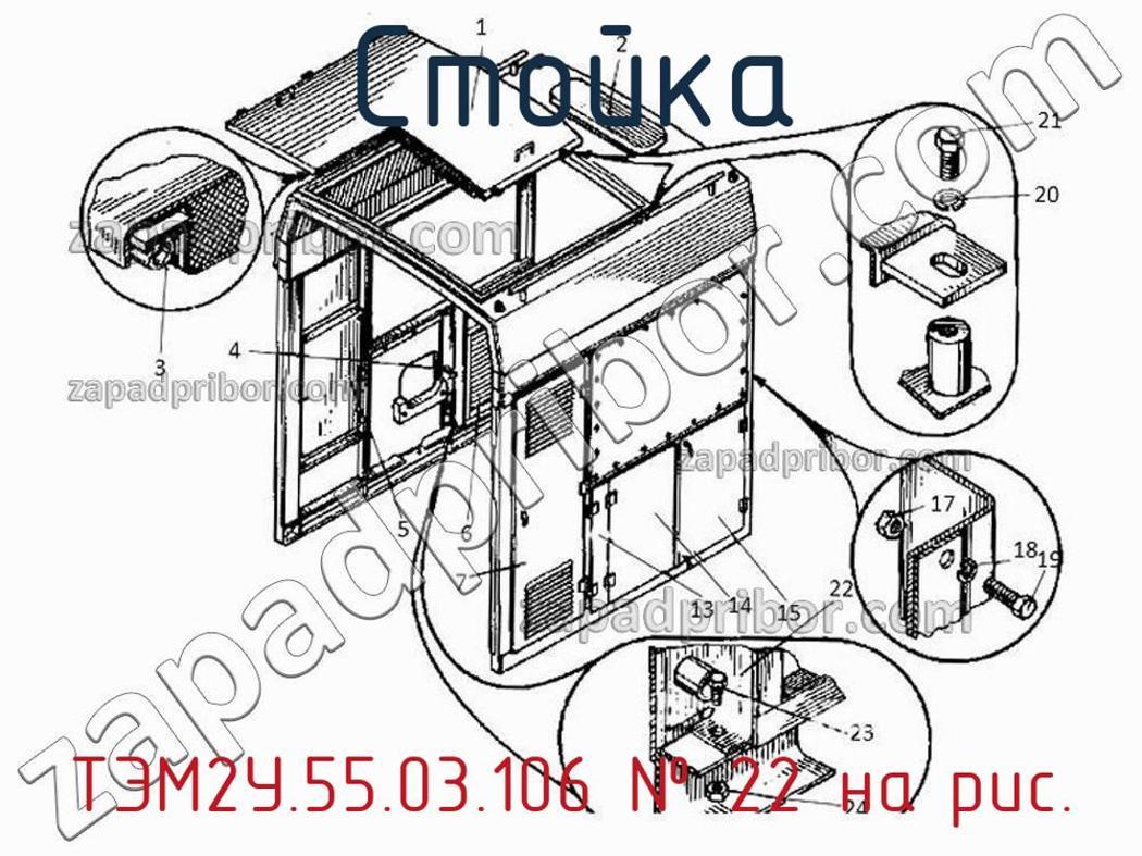 ОТК компании гарантирует отсутствие брака у всех стоек представленных на нашем сайте. Для покупки ТЭМ2У.55.03.106 обратитесь в отдел продаж. Относительно информации о цене, наличии, сроках поставки, гарантии обращайтесь по телефонам, указанным в контактах или оставьте запрос через форму обратной связи. Стойка съемная ТЭМ2У.55.03.106, номер 22 на чертеже, Кузов над высоковольтной камерой ТЭМ2С.55.04.000 и другие запасные части для , а также другие стойки и похожие изделия представлены на сайте zapadpribor.com.