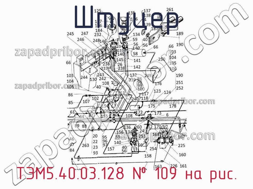 Мы даем гарантию на отсутствие брака или других несоответствий технической документации. По вопросам приобретения ТЭМ5.40.03.128 обращайтесь в отдел продаж. Наши менеджеры предоставят всю интересующую Вас информацию по поводу цены, наличия, сроков доставки, гарантии или ответят на любые другие вопросы. Штуцер ТЭМ5.40.03.128, номер 109 на чертеже, Воздухопровод тормоза (часть 2) и другие запасные части для , а также другие штуцеры и похожие изделия представлены на сайте zapadpribor.com.
