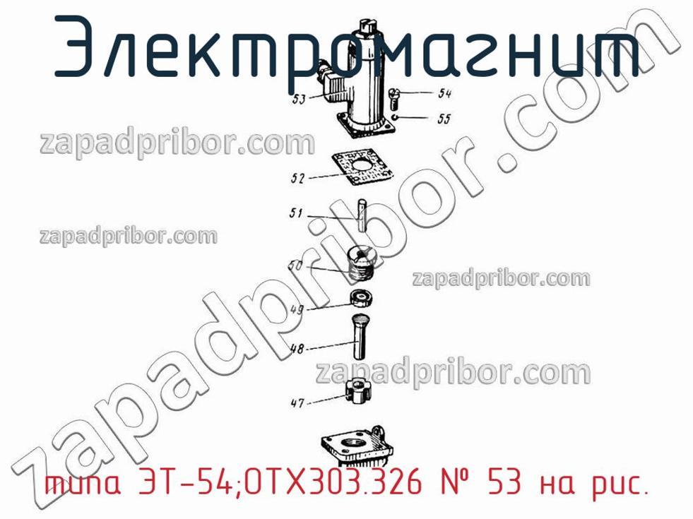 ОТК компании гарантирует отсутствие дефектов у всех электромагнитов на нашем сайте. Для покупки типа ЭТ-54;ОТХ303.326 свяжитесь с отделом продаж. Менеджеры компании предоставят всю информацию о цене, наличии, сроках доставки, гарантии и ответят на любые другие вопросы. Электромагнит тяговый, номер 53 на чертеже, (46-55) Регулятор 2Д100.36.1СБ и другие запасные части для 49 (Ч 26/26) , а также другие электромагниты и похожие изделия представлены на сайте zapadpribor.com.