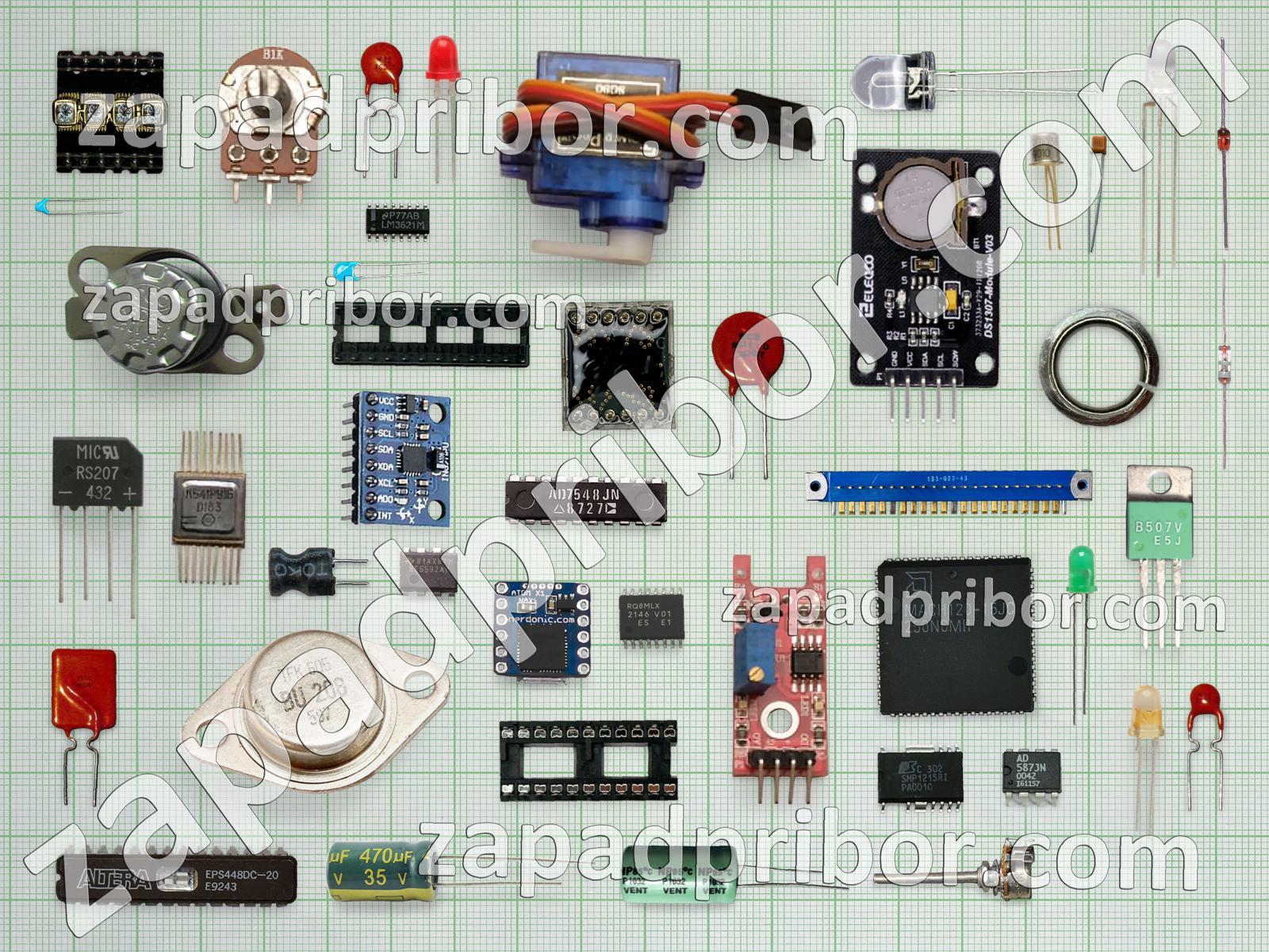 Кроме этих радиодеталей на нашем сайте вы сможете найти большой перечень компонентов. Осуществляйте поиск по основным типам радиодеталей таких как светодиод, разъем, микросхема, дисплей, тумблер, экран, датчик, реле, фотодиод, преобразователь, переключатель, резонатор, трансформатор, соединитель, конденсатор, колодки, тиристор, индикатор, адаптер, кнопка, дроссель, диод, транзистор, диодный мост, индуктивность, контакты, усилитель, резистор и другие.