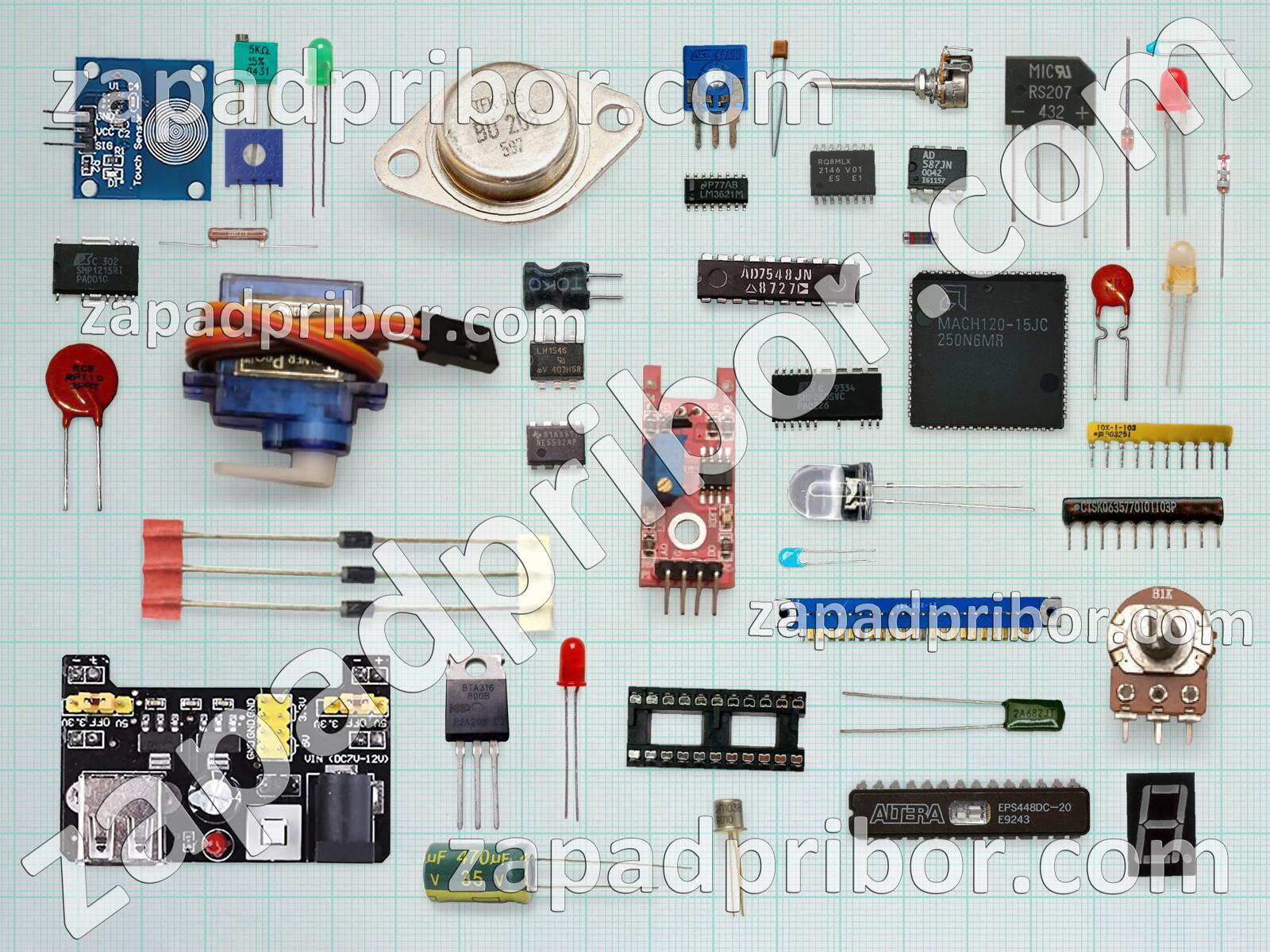 Кроме этих радиодеталей на нашем сайте вы сможете найти большой перечень компонентов. Осуществляйте поиск по основным типам радиодеталей таких как дисплей, микросхема, резистор, тумблер, экран, трансформатор, резонатор, реле, фотодиод, разъем, транзистор, контакты, индикатор, колодки, диод, усилитель, датчик, преобразователь, конденсатор, диодный мост, кнопка, светодиод, тиристор, индуктивность, дроссель, адаптер, переключатель, соединитель и другие.