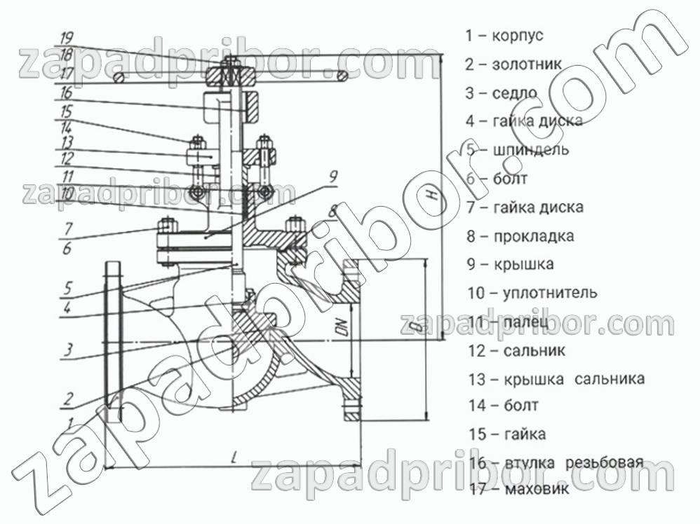 Корпус – Сталь 20 Л; Золотник – Сталь 20 Л; Шпиндель – Сталь 20х13; Прокладка – Паронит ПА; Крышка – сталь 20Л; Гайка – Сталь 25; Шпилька – Сталь 35; Набивка сальника – Графитонаполненный фторопласт; Сальник – Сталь 20 Л; Гайка – Сталь 25; Болт откидной – Сталь 35; Втулка резьбовая – ЛП-40с; Маховик – Сталь 25 или серый чугун; Контргайка – Сталь 35;