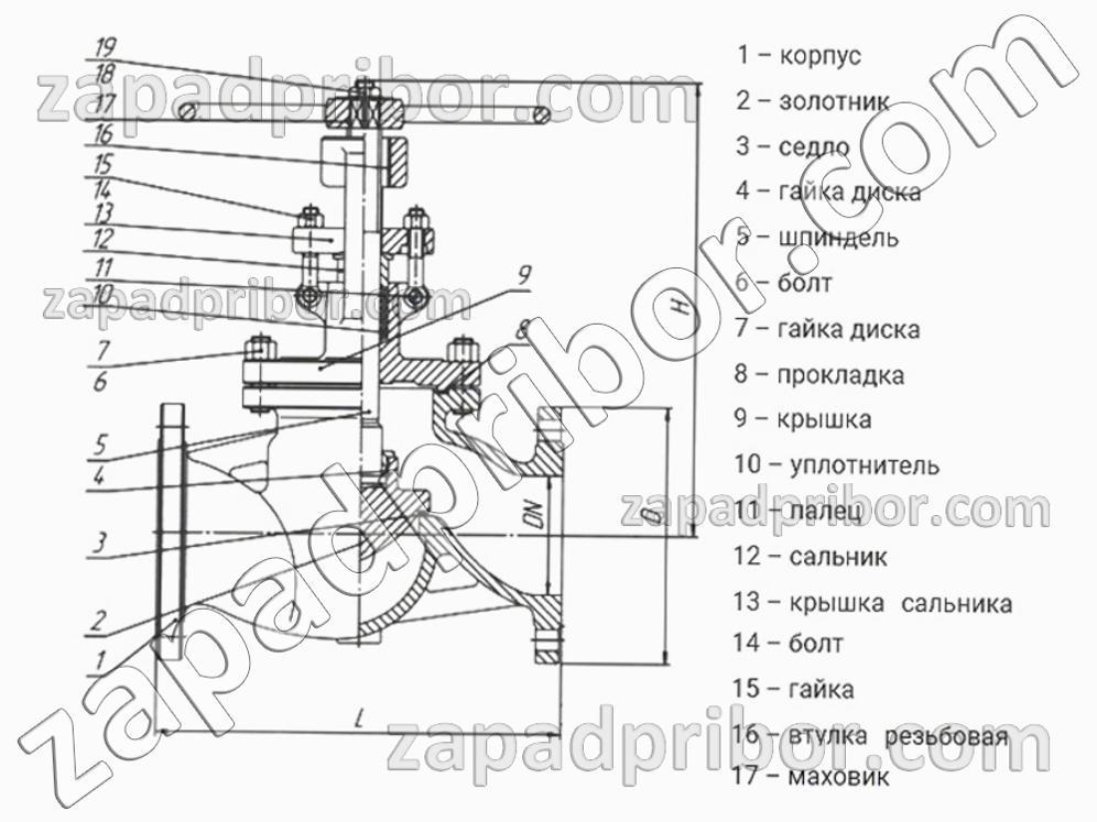 Корпус – Сталь 20 Л; Золотник – Сталь 20 Л; Шпиндель – Сталь 20х13; Прокладка – Паронит ПА; Крышка – сталь 20Л; Гайка – Сталь 25; Шпилька – Сталь 35; Набивка сальника – Графитонаполненный фторопласт; Сальник – Сталь 20 Л; Гайка – Сталь 25; Болт откидной – Сталь 35; Втулка резьбовая – ЛП-40с; Маховик – Сталь 25 или серый чугун; Контргайка – Сталь 35;