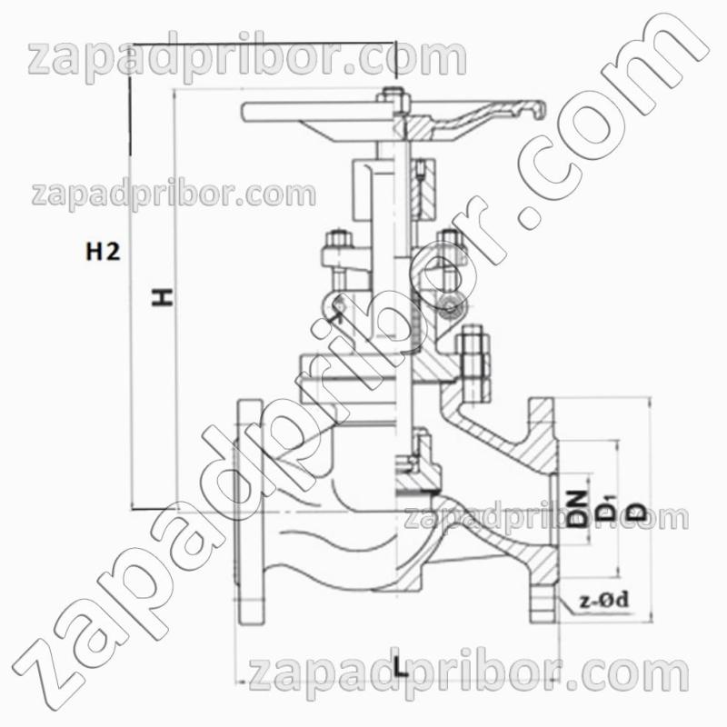 Корпус – Сталь 20 Л; Золотник – Сталь 20 Л; Шпиндель – Сталь 20х13; Прокладка – Паронит ПА; Крышка – сталь 20Л; Гайка – Сталь 25; Шпилька – Сталь 35; Набивка сальника – Графитонаполненный фторопласт; Сальник – Сталь 20 Л; Гайка – Сталь 25; Болт откидной – Сталь 35; Втулка резьбовая – ЛП-40с; Маховик – Сталь 25 или серый чугун; Контргайка – Сталь 35;