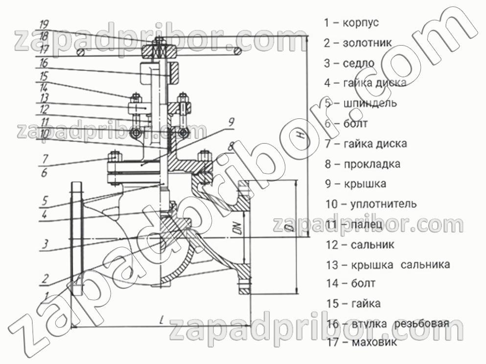 Корпус – Сталь 20 Л; Золотник – Сталь 20 Л; Шпиндель – Сталь 20х13; Прокладка – Паронит ПА; Крышка – сталь 20Л; Гайка – Сталь 25; Шпилька – Сталь 35; Набивка сальника – Графитонаполненный фторопласт; Сальник – Сталь 20 Л; Гайка – Сталь 25; Болт откидной – Сталь 35; Втулка резьбовая – ЛП-40с; Маховик – Сталь 25 или серый чугун; Контргайка – Сталь 35;