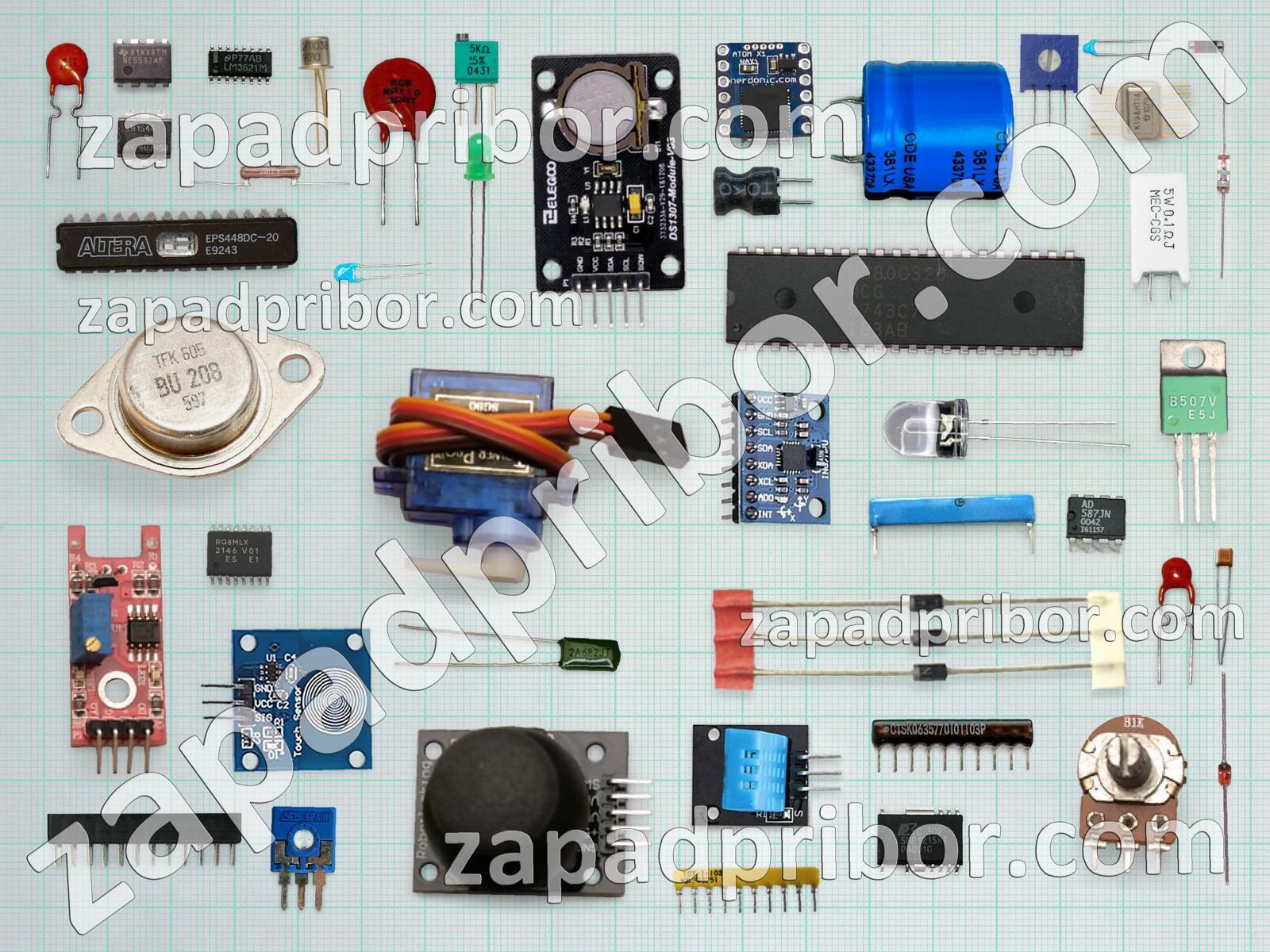 Кроме этих радиодеталей на нашем сайте вы сможете найти большой перечень компонентов. Осуществляйте поиск по основным типам радиодеталей таких как датчик, резистор, дроссель, тиристор, индикатор, реле, соединитель, разъем, усилитель, кнопка, резонатор, светодиод, диодный мост, дисплей, индуктивность, микросхема, диод, фотодиод, контакты, переключатель, тумблер, адаптер, транзистор, конденсатор, трансформатор, колодки, экран, преобразователь и другие.