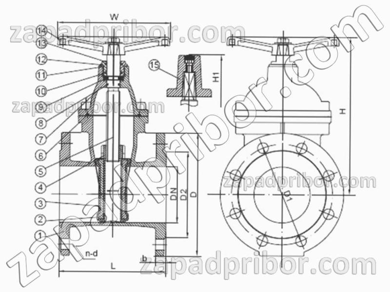 14. Маховик Чугун GGG50; 15. Колпачок штока Чугун GGG50.
