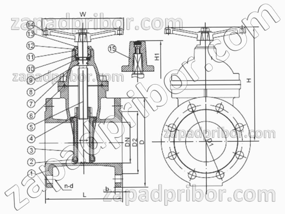 14. Маховик Чугун GGG50; 15. Колпачок штока Чугун GGG50.